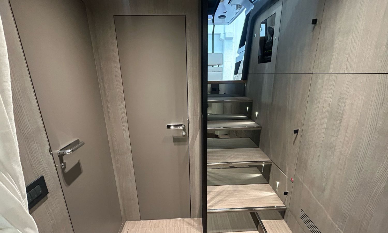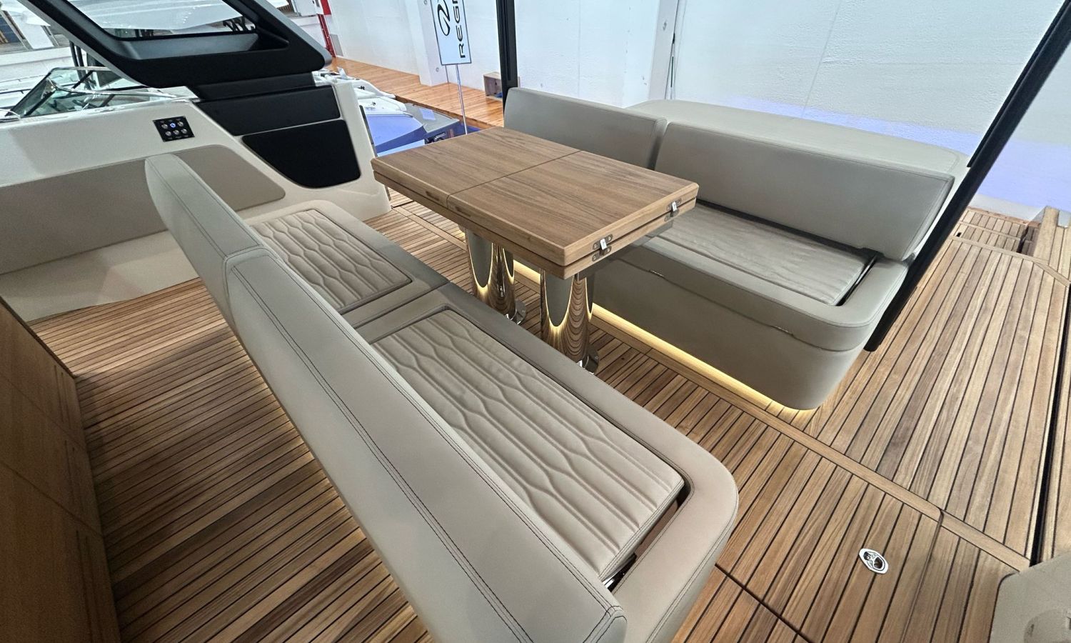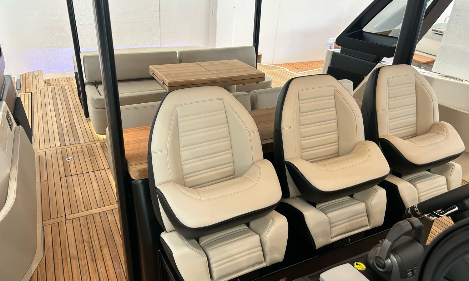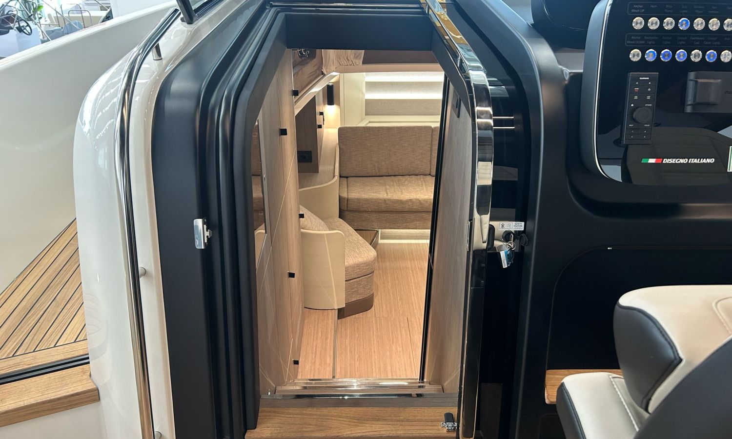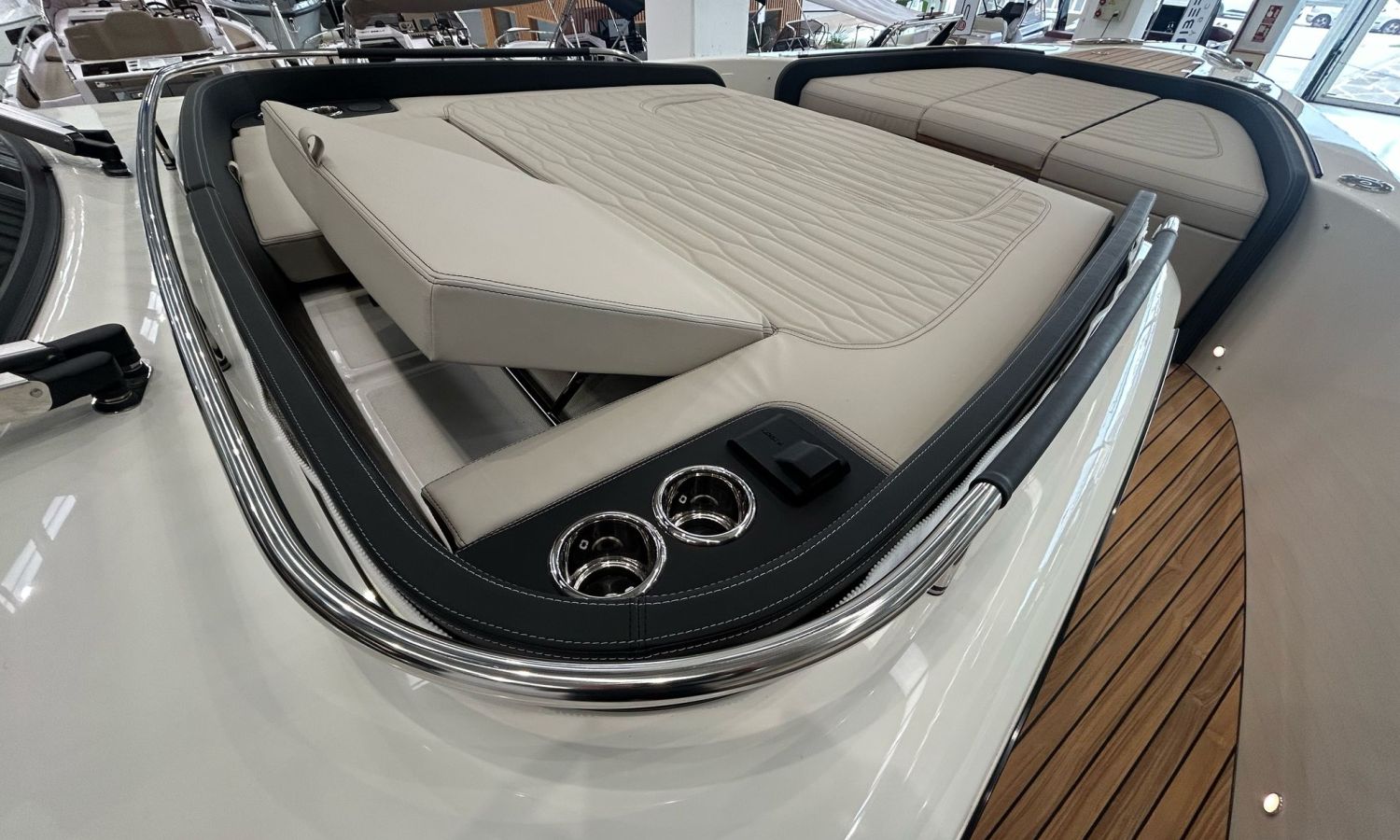 Réservoir d'eaux sales - Climatisation 16.000 BTU dans la cabine avec pompe à chaleur - Set couvertures (pour tableau de bord, siège pilote, sofa, table, meubles et coussin bain de soleil à l'arrière) - Correcteurs d'assiette Automatic List + correcteurs de virée Coordinated Turn Control - Propulseur d'étrave - Réfrigérateur dans le cockpit - Générateur 8 kW - Barbecue électrique dans le cockpit - Ice-maker - Côtés repliables à l'arrière droite et gauche - Passerelle hydraulique - Pilote automatique - Plateforme hydraulique montée/descente - Cockpit et parois latérales pliantes en teck - Teck sur les passes-avant - T-Top - VHF - Certificat CE - T-Top laqué - Pré-disposition pour Seakeeper 6 - Préparation, lancement et livraison avec test en mer - Transport chantier naval à Costa Brava.Description du bateau