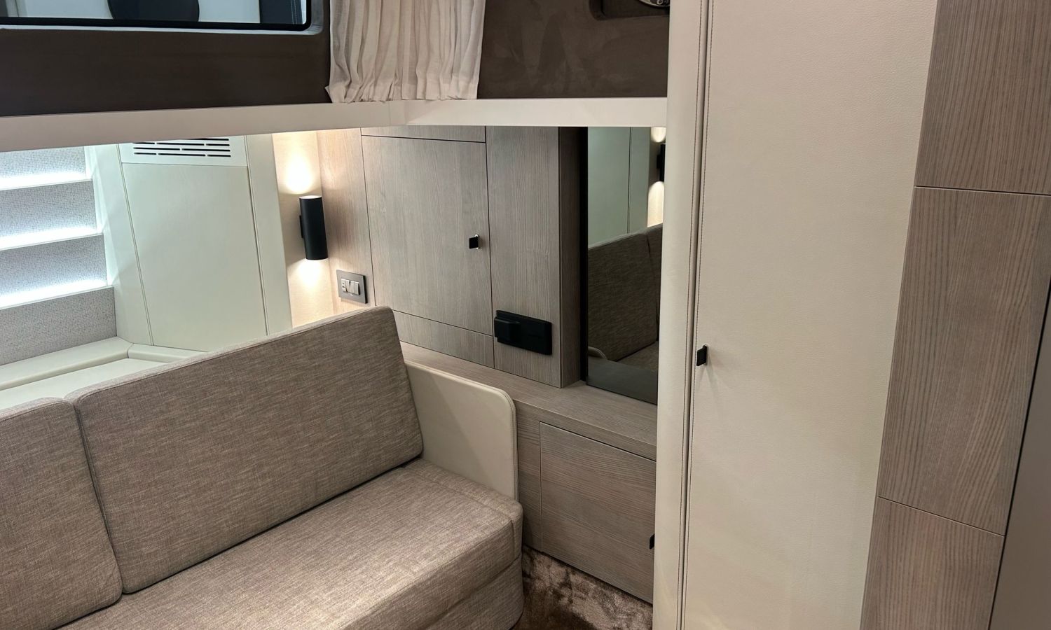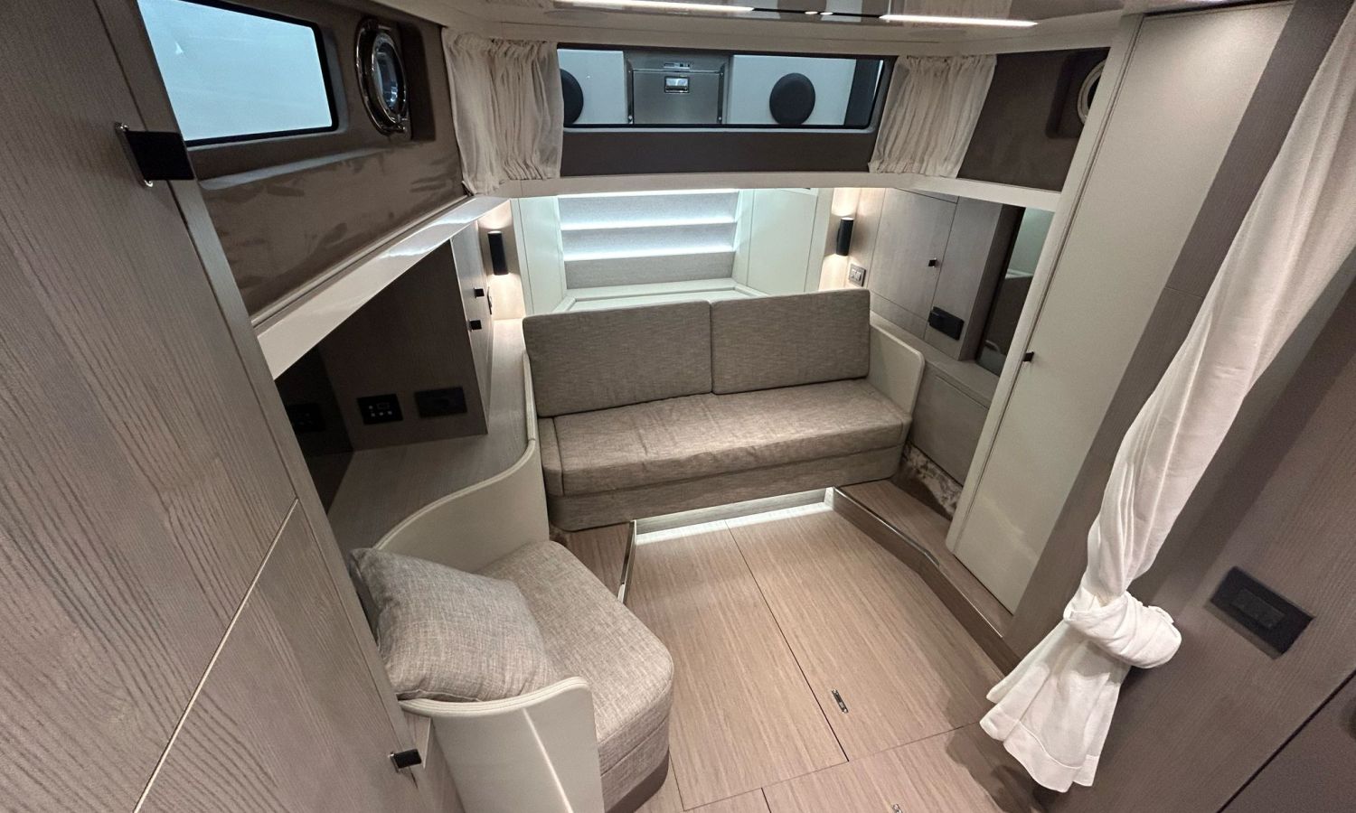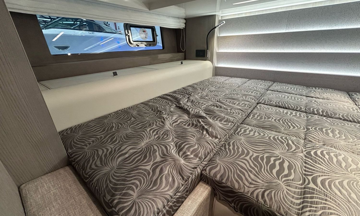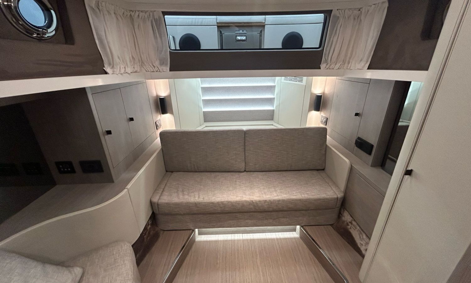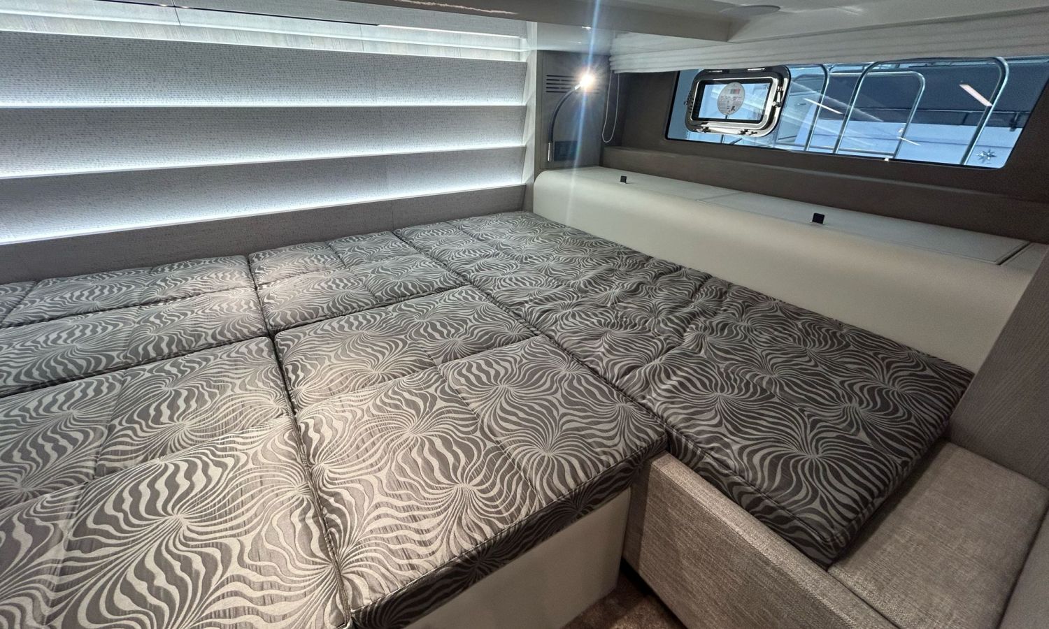 Réservoir d'eaux sales - Climatisation 16.000 BTU dans la cabine avec pompe à chaleur - Set couvertures (pour tableau de bord, siège pilote, sofa, table, meubles et coussin bain de soleil à l'arrière) - Correcteurs d'assiette Automatic List + correcteurs de virée Coordinated Turn Control - Propulseur d'étrave - Réfrigérateur dans le cockpit - Générateur 8 kW - Barbecue électrique dans le cockpit - Ice-maker - Côtés repliables à l'arrière droite et gauche - Passerelle hydraulique - Pilote automatique - Plateforme hydraulique montée/descente - Cockpit et parois latérales pliantes en teck - Teck sur les passes-avant - T-Top - VHF - Certificat CE - T-Top laqué - Pré-disposition pour Seakeeper 6 - Préparation, lancement et livraison avec test en mer - Transport chantier naval à Costa Brava.Description du bateau