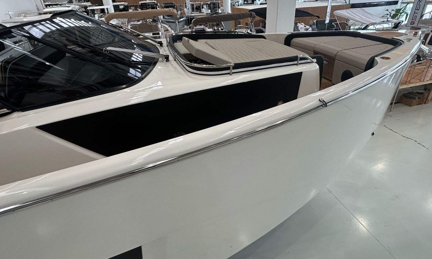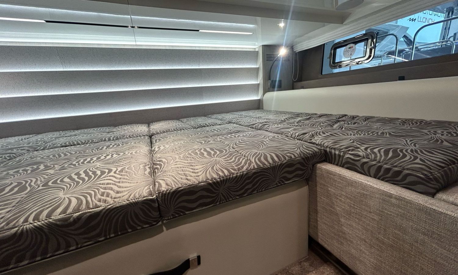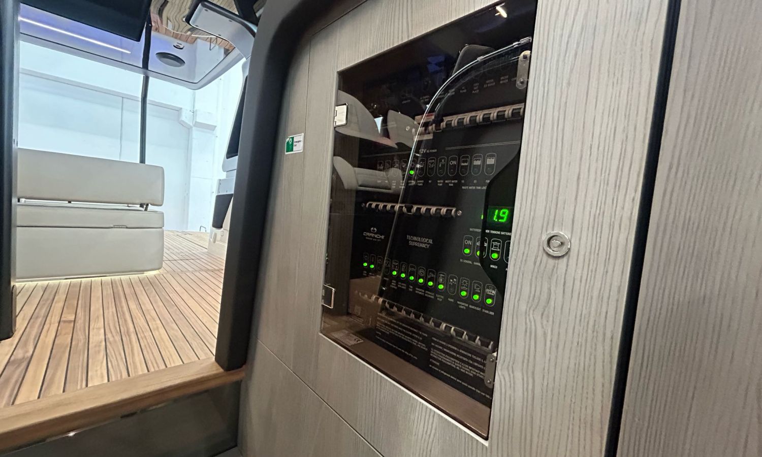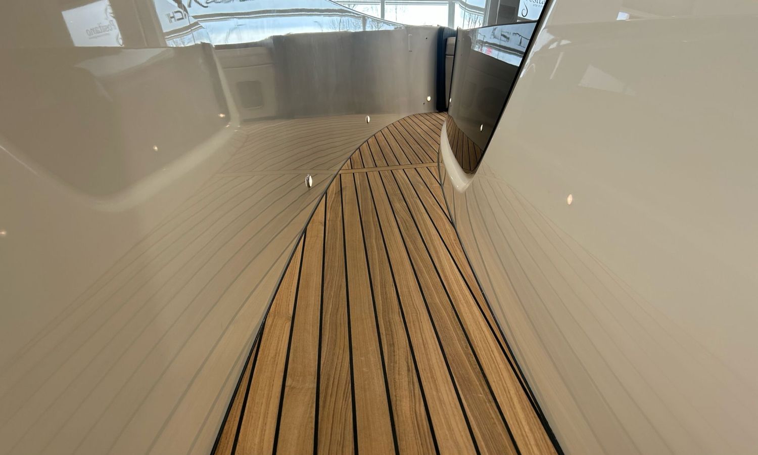 Réservoir d'eaux sales - Climatisation 16.000 BTU dans la cabine avec pompe à chaleur - Set couvertures (pour tableau de bord, siège pilote, sofa, table, meubles et coussin bain de soleil à l'arrière) - Correcteurs d'assiette Automatic List + correcteurs de virée Coordinated Turn Control - Propulseur d'étrave - Réfrigérateur dans le cockpit - Générateur 8 kW - Barbecue électrique dans le cockpit - Ice-maker - Côtés repliables à l'arrière droite et gauche - Passerelle hydraulique - Pilote automatique - Plateforme hydraulique montée/descente - Cockpit et parois latérales pliantes en teck - Teck sur les passes-avant - T-Top - VHF - Certificat CE - T-Top laqué - Pré-disposition pour Seakeeper 6 - Préparation, lancement et livraison avec test en mer - Transport chantier naval à Costa Brava.Description du bateau