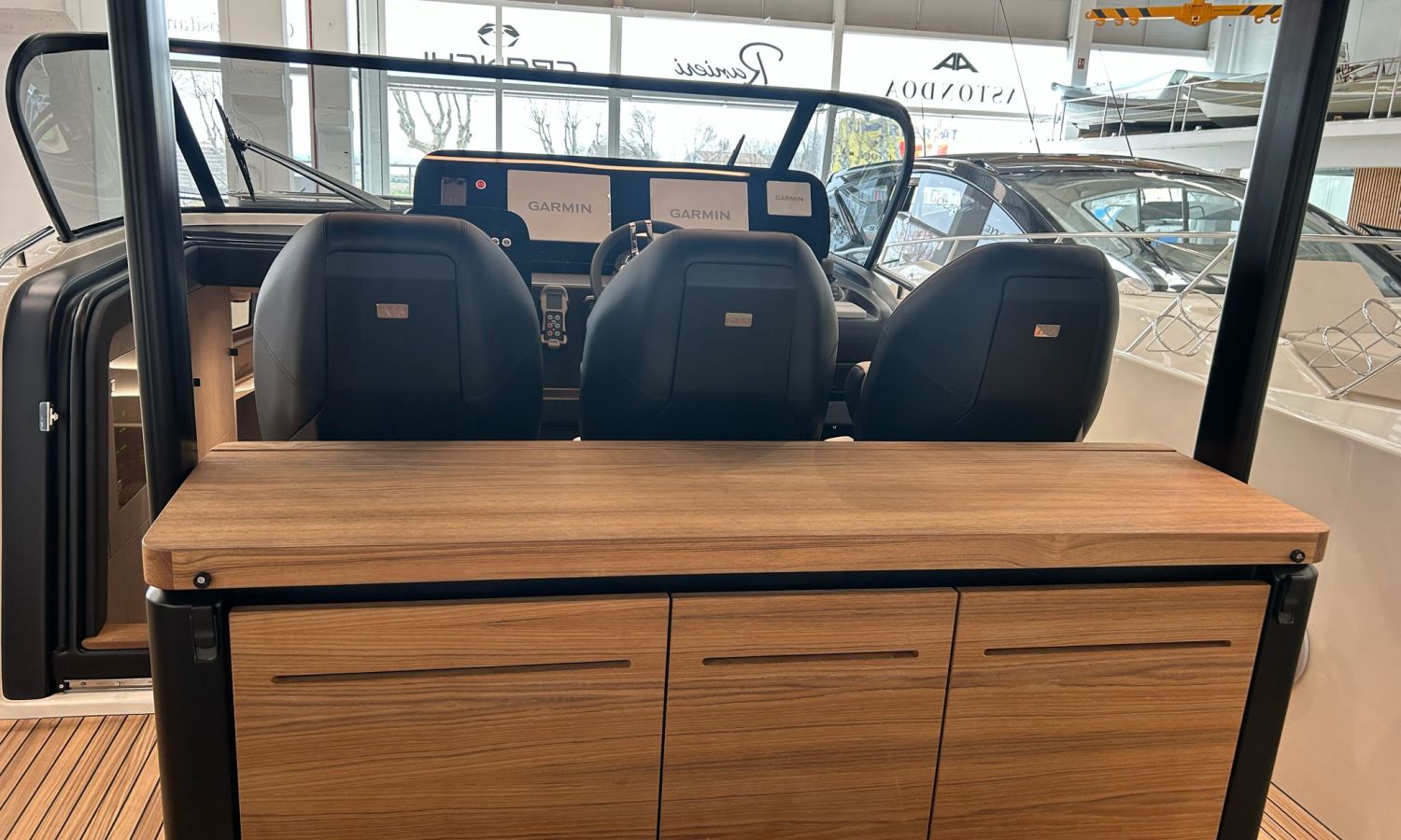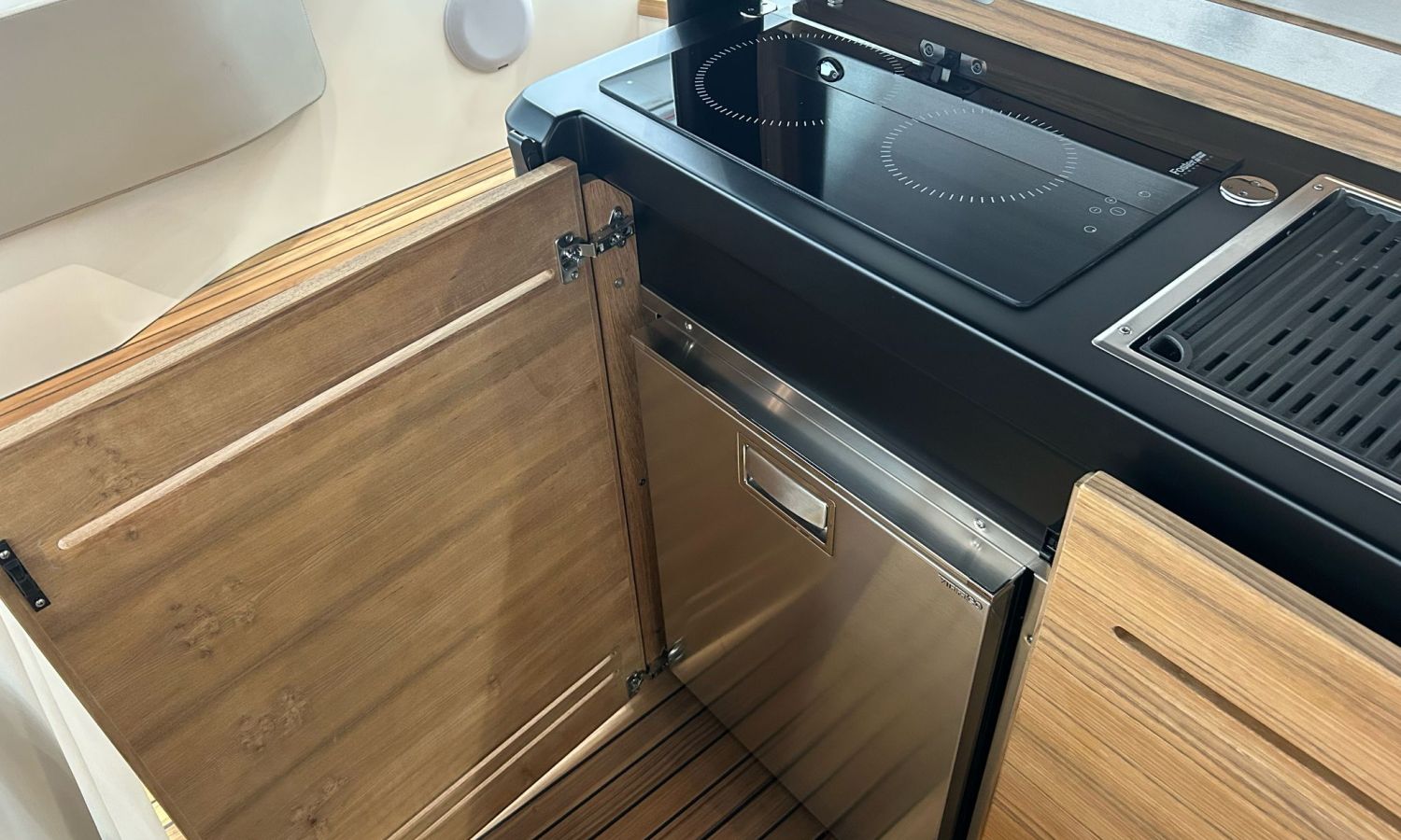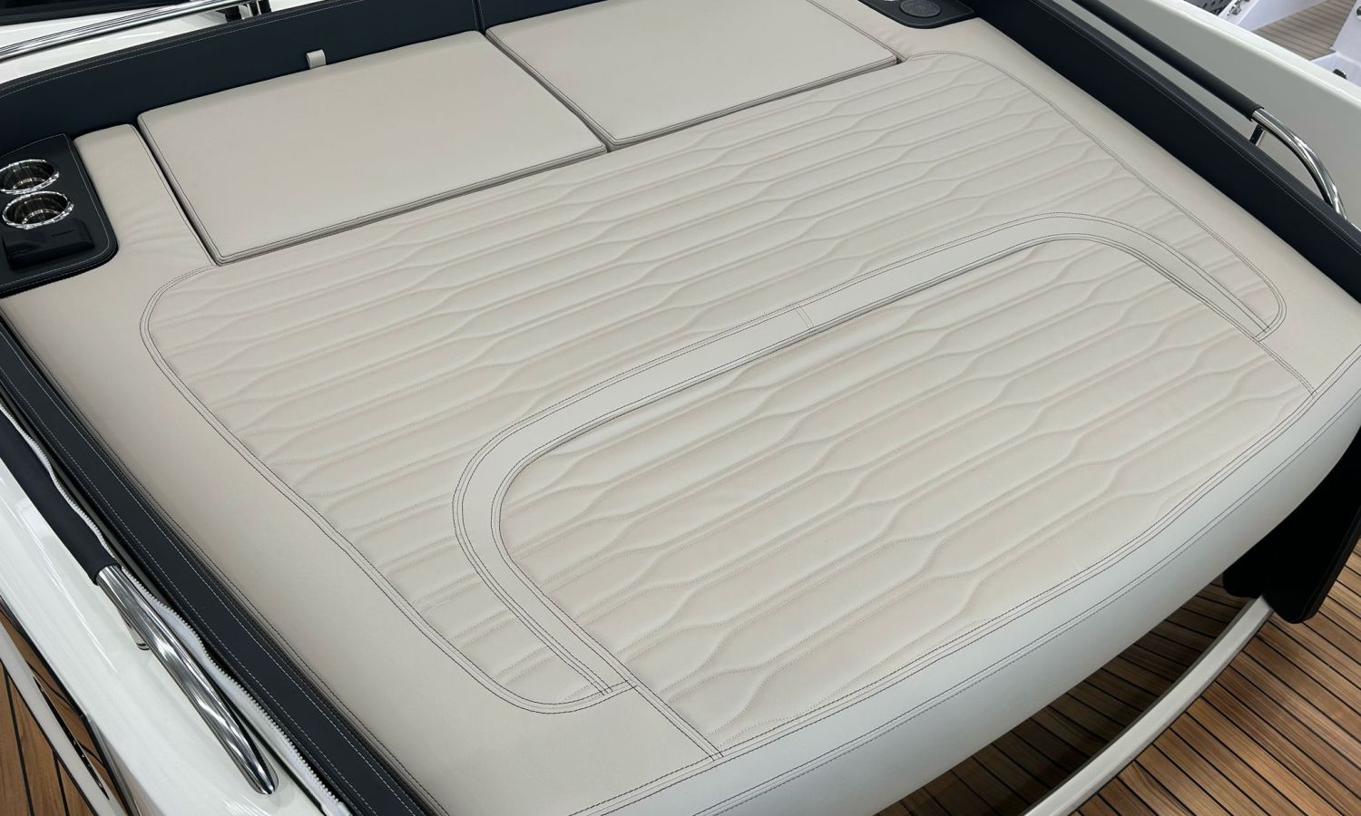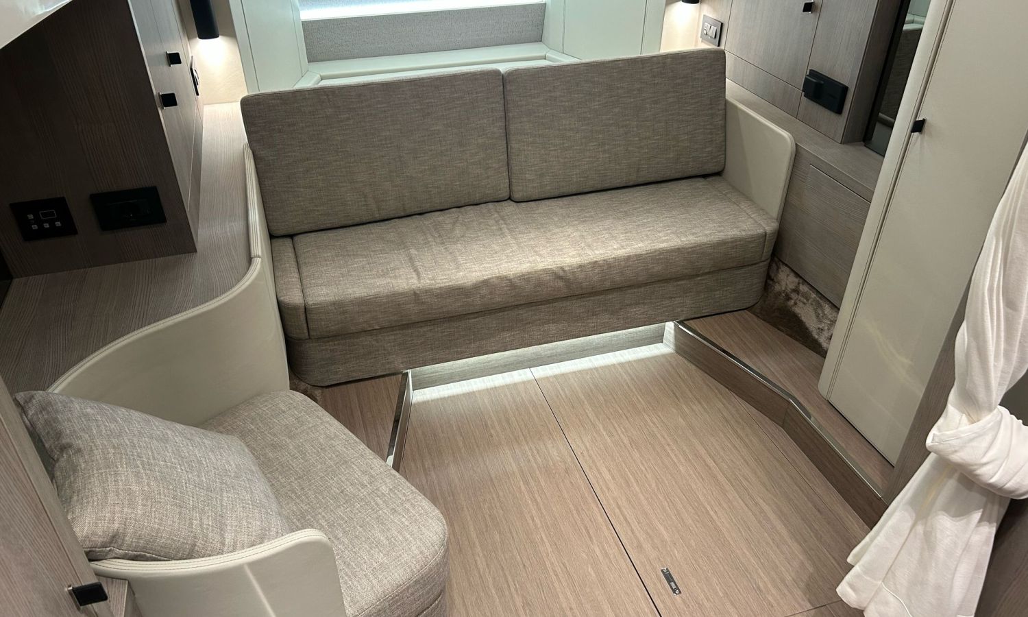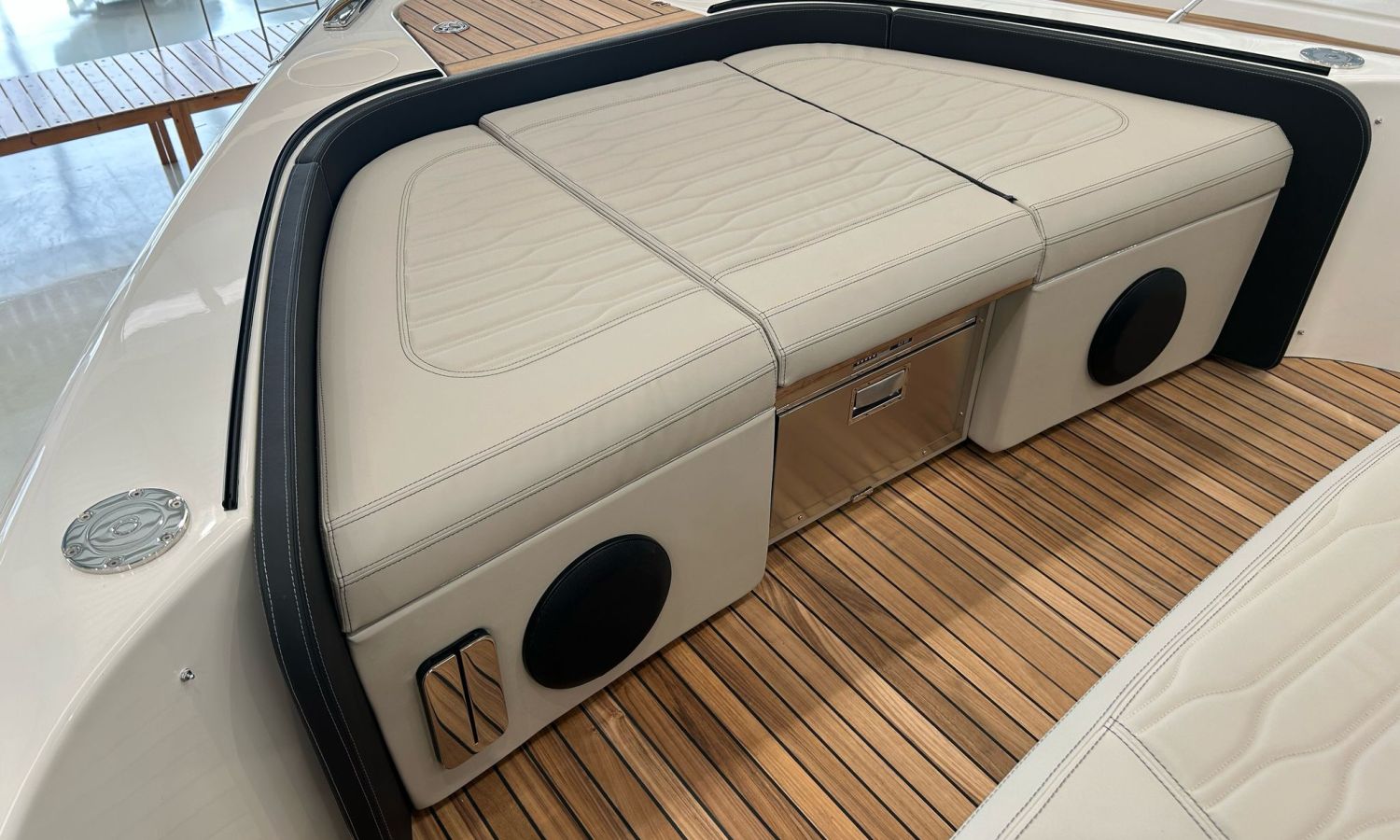 Réservoir d'eaux sales - Climatisation 16.000 BTU dans la cabine avec pompe à chaleur - Set couvertures (pour tableau de bord, siège pilote, sofa, table, meubles et coussin bain de soleil à l'arrière) - Correcteurs d'assiette Automatic List + correcteurs de virée Coordinated Turn Control - Propulseur d'étrave - Réfrigérateur dans le cockpit - Générateur 8 kW - Barbecue électrique dans le cockpit - Ice-maker - Côtés repliables à l'arrière droite et gauche - Passerelle hydraulique - Pilote automatique - Plateforme hydraulique montée/descente - Cockpit et parois latérales pliantes en teck - Teck sur les passes-avant - T-Top - VHF - Certificat CE - T-Top laqué - Pré-disposition pour Seakeeper 6 - Préparation, lancement et livraison avec test en mer - Transport chantier naval à Costa Brava.Description du bateau