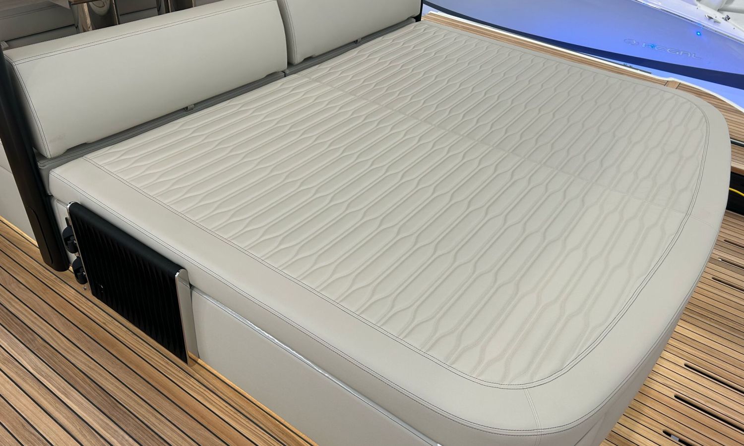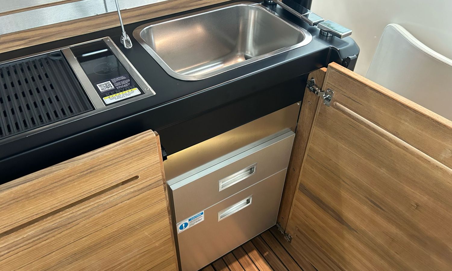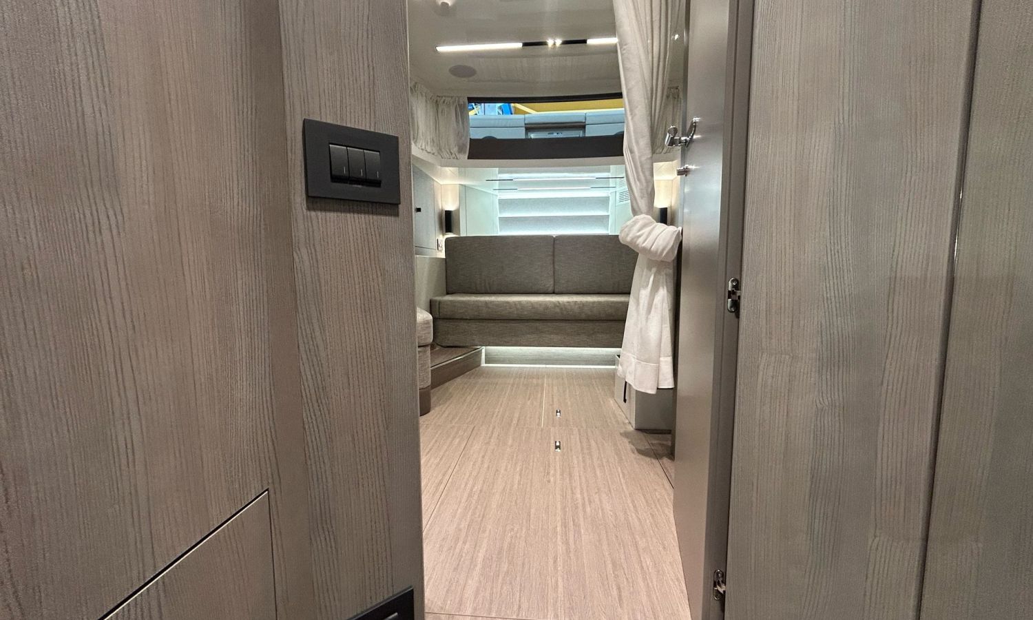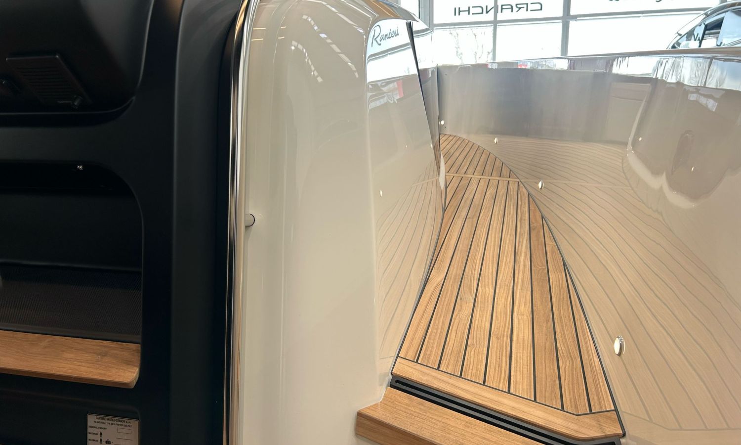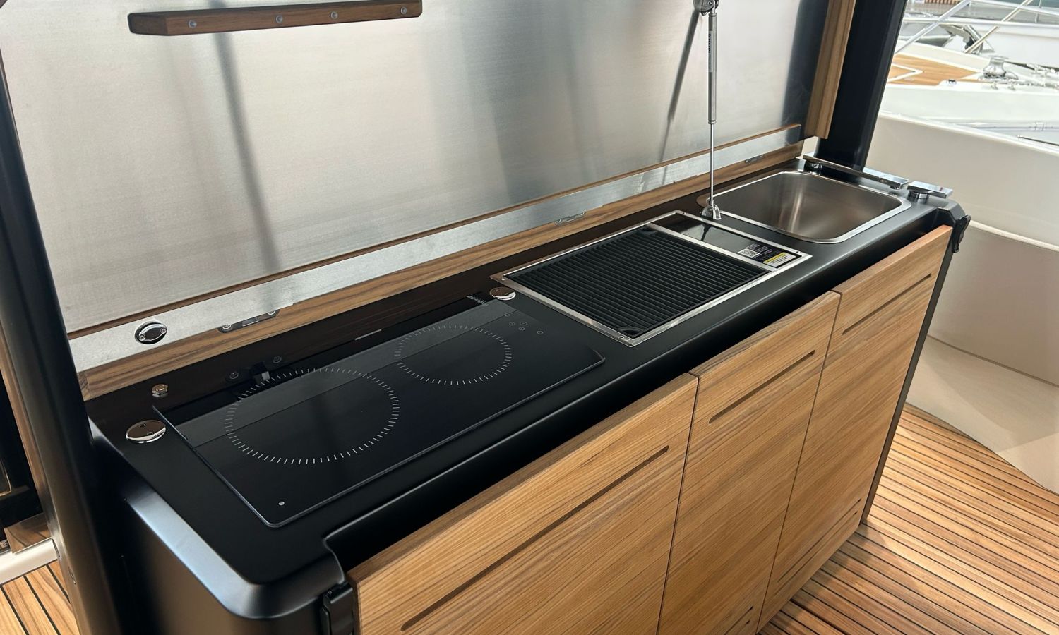 Réservoir d'eaux sales - Climatisation 16.000 BTU dans la cabine avec pompe à chaleur - Set couvertures (pour tableau de bord, siège pilote, sofa, table, meubles et coussin bain de soleil à l'arrière) - Correcteurs d'assiette Automatic List + correcteurs de virée Coordinated Turn Control - Propulseur d'étrave - Réfrigérateur dans le cockpit - Générateur 8 kW - Barbecue électrique dans le cockpit - Ice-maker - Côtés repliables à l'arrière droite et gauche - Passerelle hydraulique - Pilote automatique - Plateforme hydraulique montée/descente - Cockpit et parois latérales pliantes en teck - Teck sur les passes-avant - T-Top - VHF - Certificat CE - T-Top laqué - Pré-disposition pour Seakeeper 6 - Préparation, lancement et livraison avec test en mer - Transport chantier naval à Costa Brava.Description du bateau