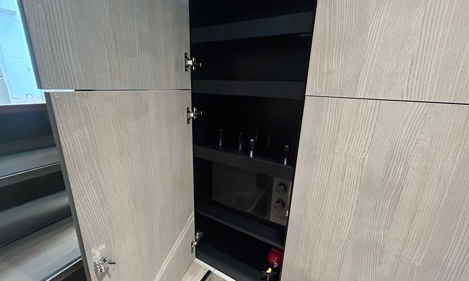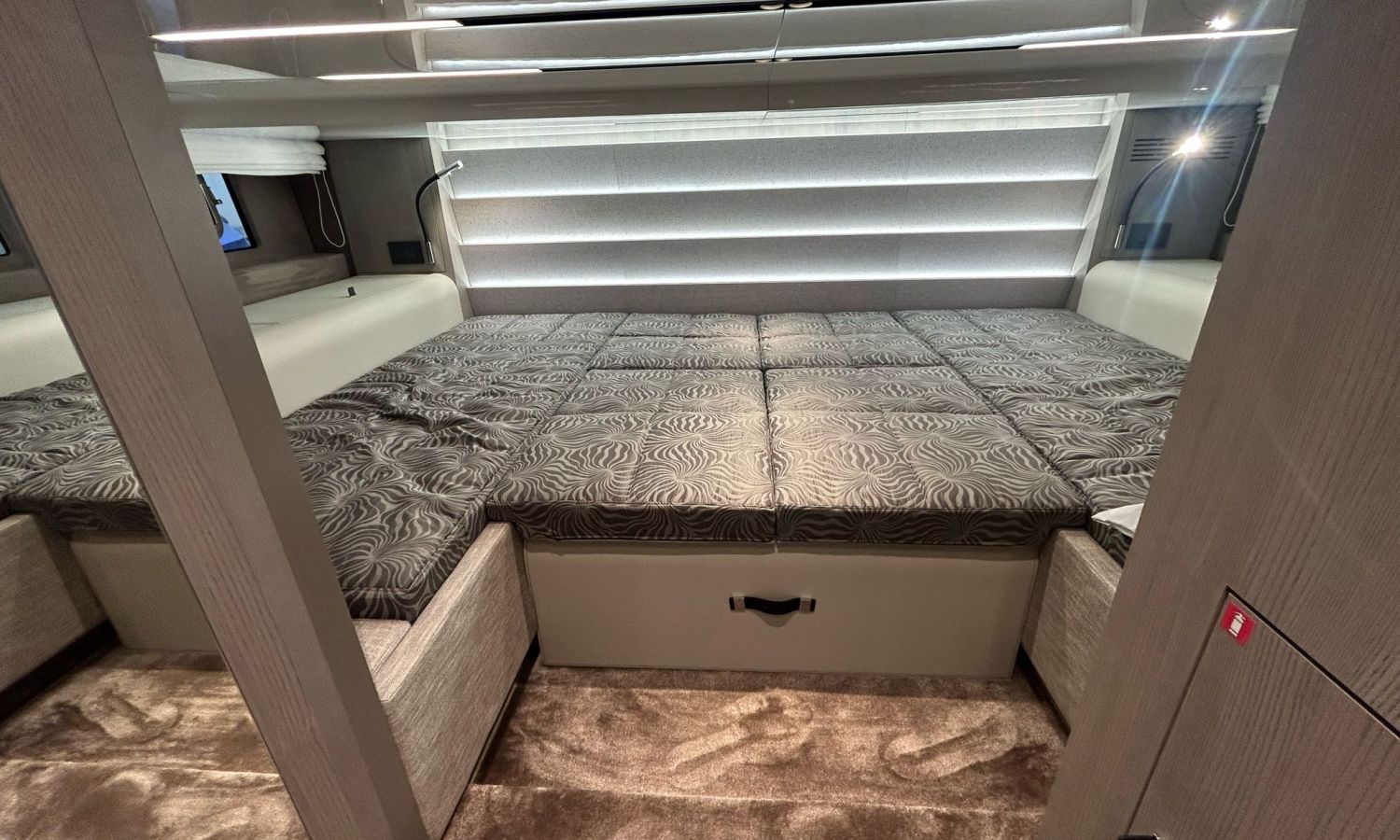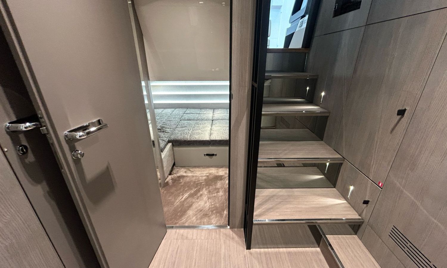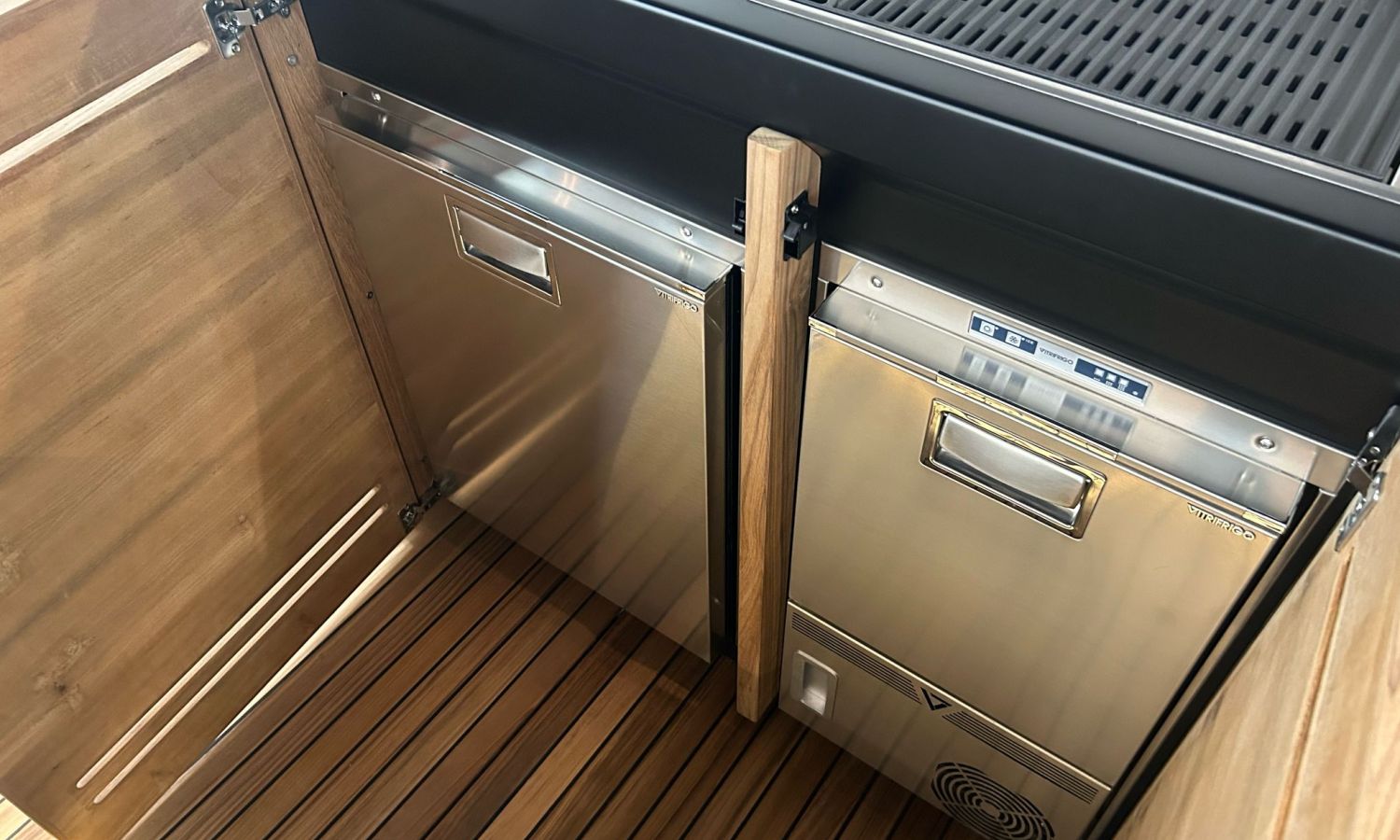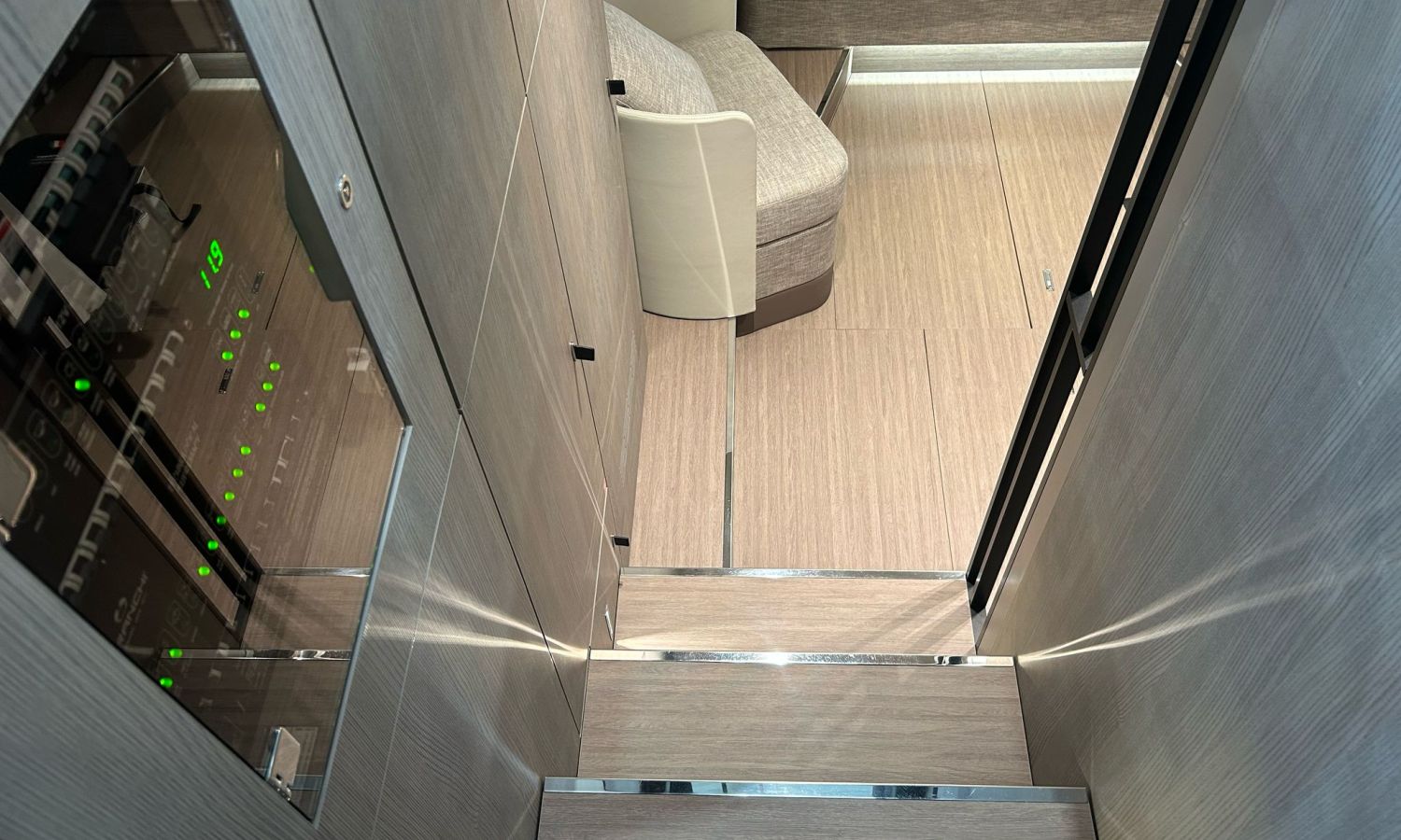 Réservoir d'eaux sales - Climatisation 16.000 BTU dans la cabine avec pompe à chaleur - Set couvertures (pour tableau de bord, siège pilote, sofa, table, meubles et coussin bain de soleil à l'arrière) - Correcteurs d'assiette Automatic List + correcteurs de virée Coordinated Turn Control - Propulseur d'étrave - Réfrigérateur dans le cockpit - Générateur 8 kW - Barbecue électrique dans le cockpit - Ice-maker - Côtés repliables à l'arrière droite et gauche - Passerelle hydraulique - Pilote automatique - Plateforme hydraulique montée/descente - Cockpit et parois latérales pliantes en teck - Teck sur les passes-avant - T-Top - VHF - Certificat CE - T-Top laqué - Pré-disposition pour Seakeeper 6 - Préparation, lancement et livraison avec test en mer - Transport chantier naval à Costa Brava.Description du bateau