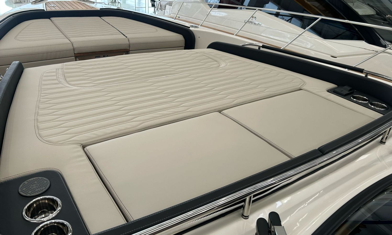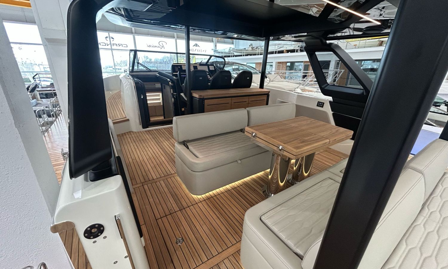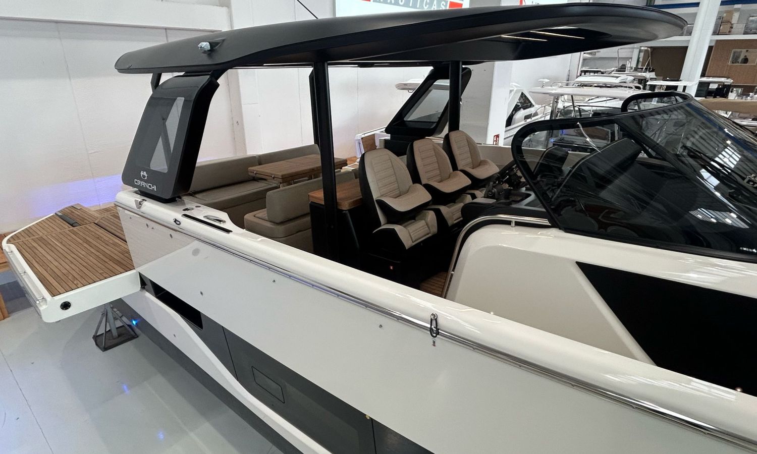 Bateau en stock. Livraison immédiate. Modèle A 46 Luxury Tender du chantier naval italien Cranchi de 14,25 mètres de longueur totale. Bateau avec hard top et un grand bain de soleil arrière. Intérieurs modernes et grande habitabilité.SOL-Nº 7957