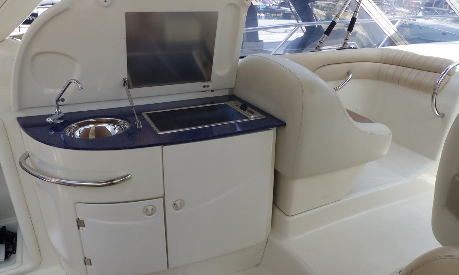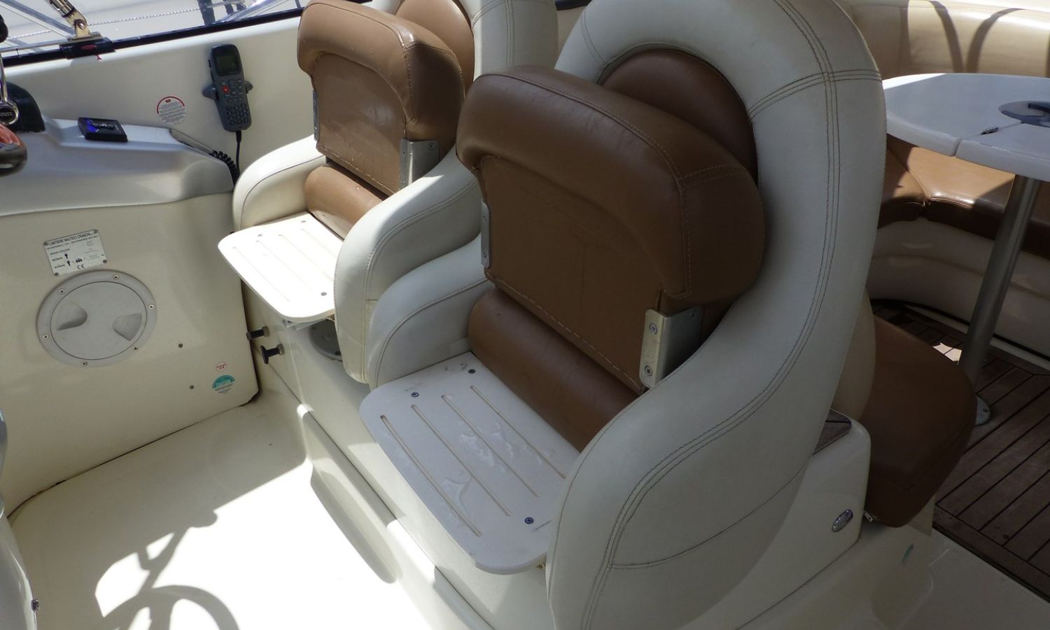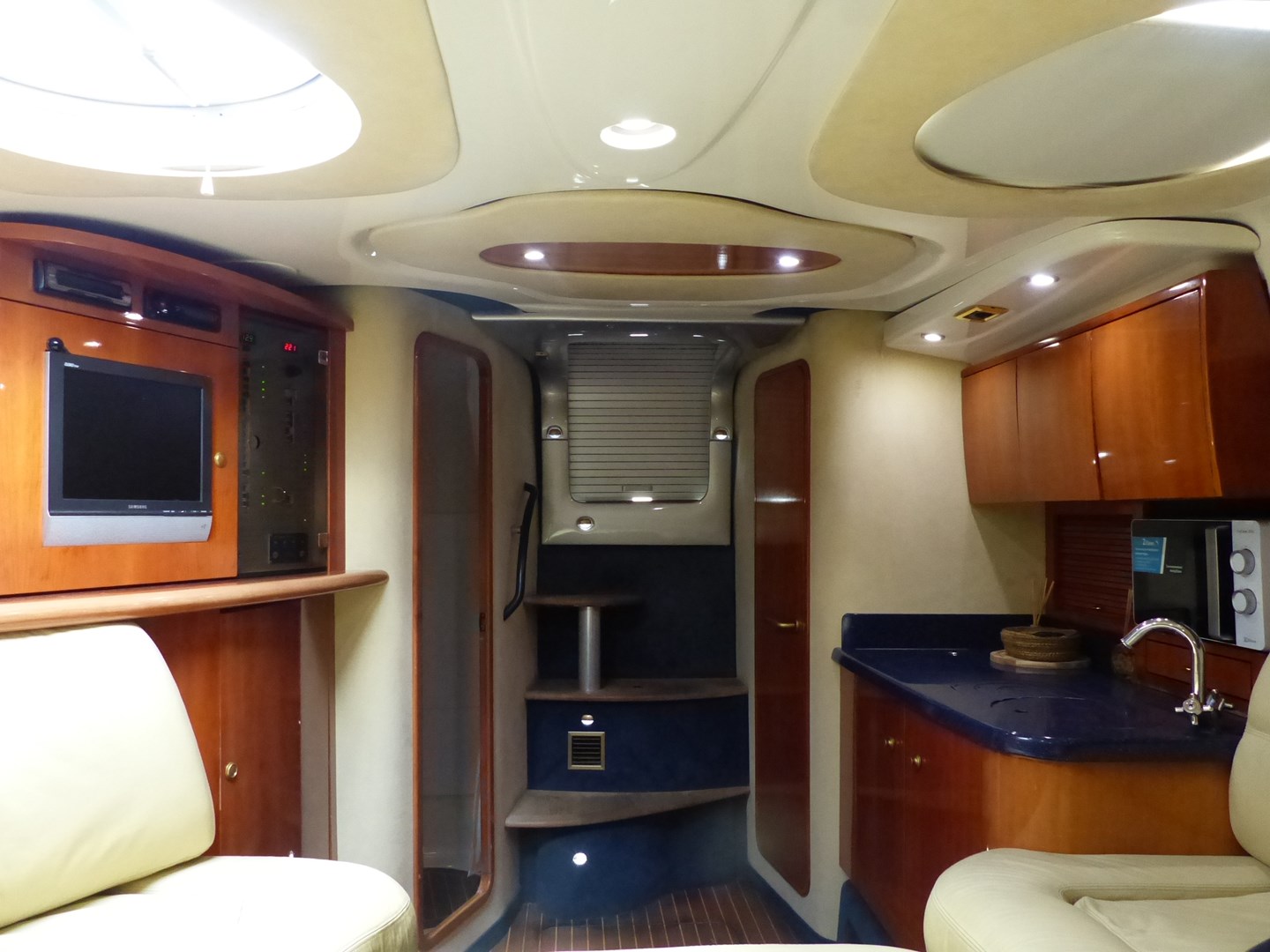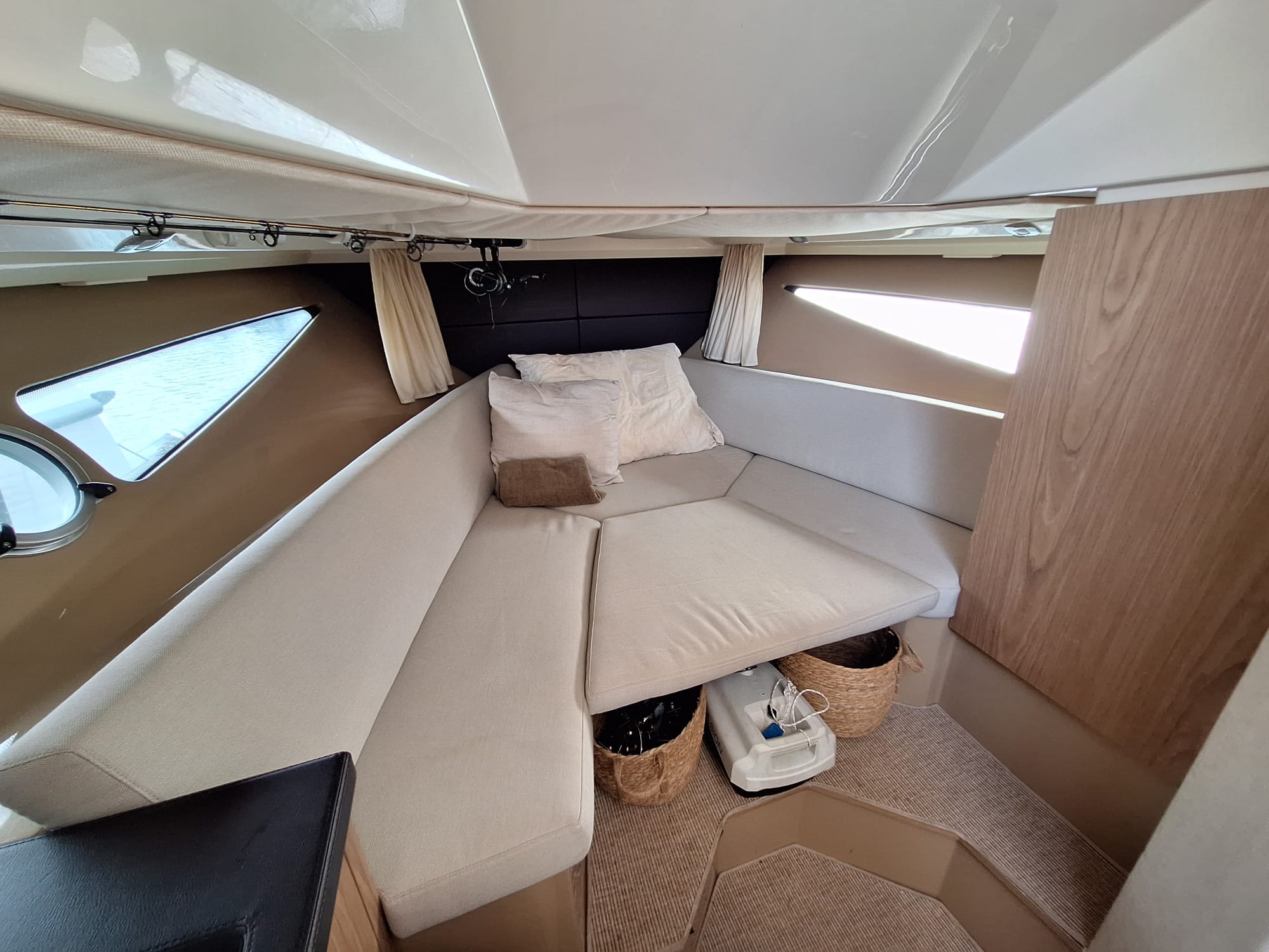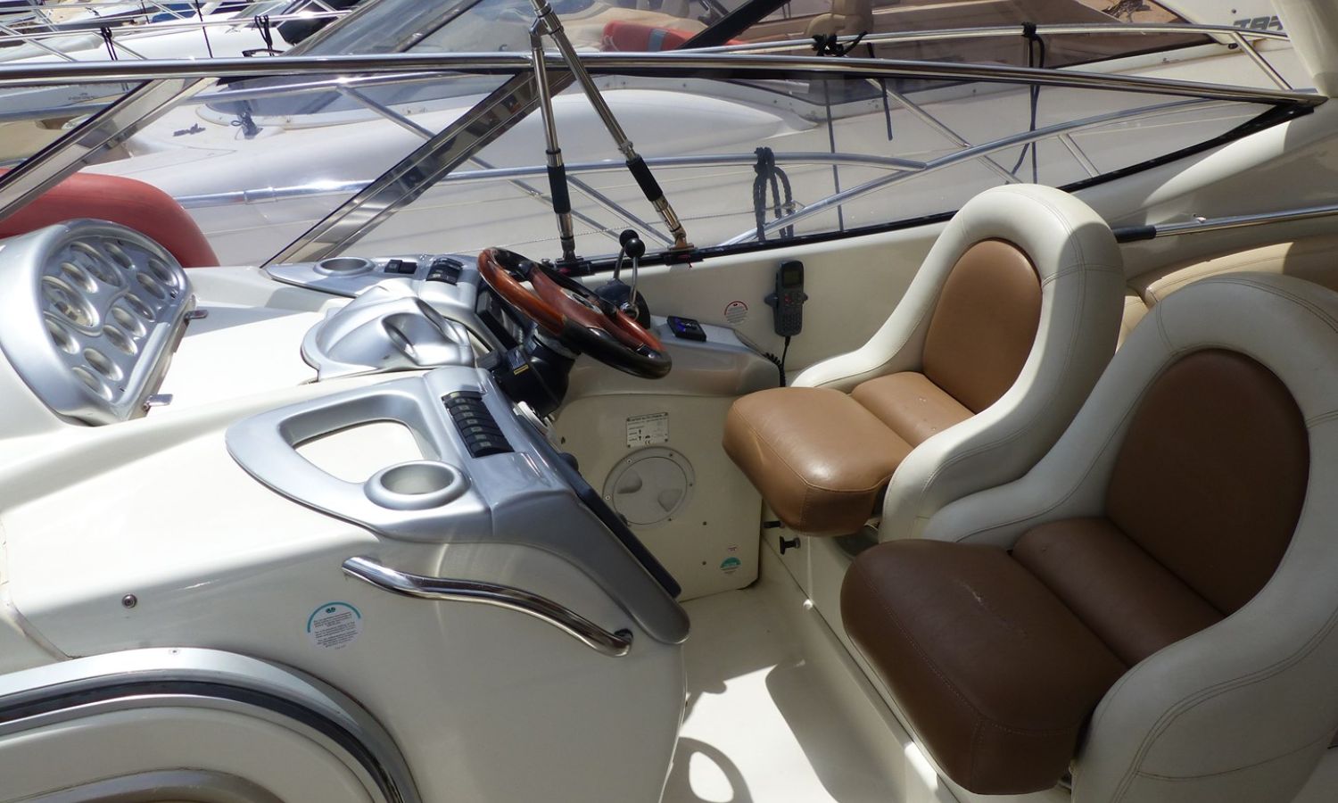 Propulseur d'étrave - Correcteurs d'assiette - Prise de quai 220 V. - Chargeur de batterie - Cockpit et plateforme de bain en teck - Barbecoue de cockpit - Réfrigérateur - Guideau électrique - Coussins de bain de soleil avant - Douchette arrière - Table de cockpit - Coomandes électroniques - Gps/Plotter/Sondeur - Indicateur d'angle de barre - Compas - Vhf -Equipement audio - Wc marin avec réservoir d'eaux noires - Douche - Cuisine électrique - Evier - Micro-ondes - Arceau radar repliable hydrauliquement - Antifouling.Description du bateau