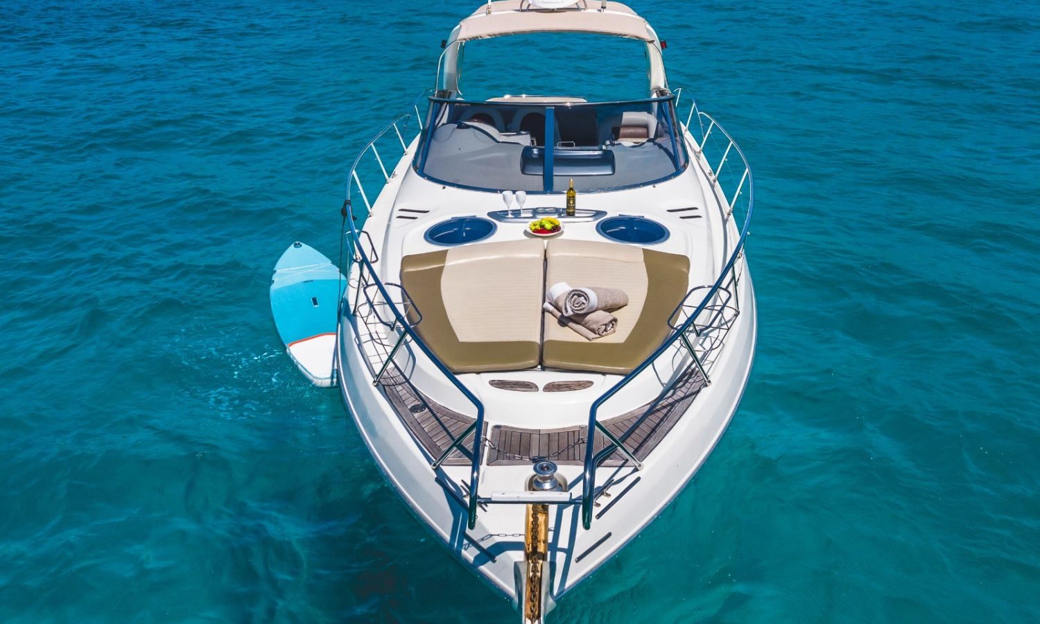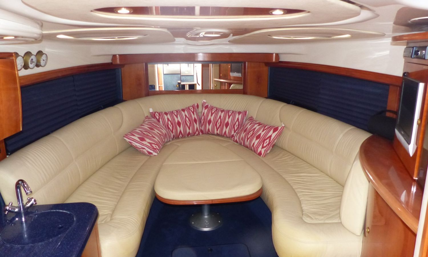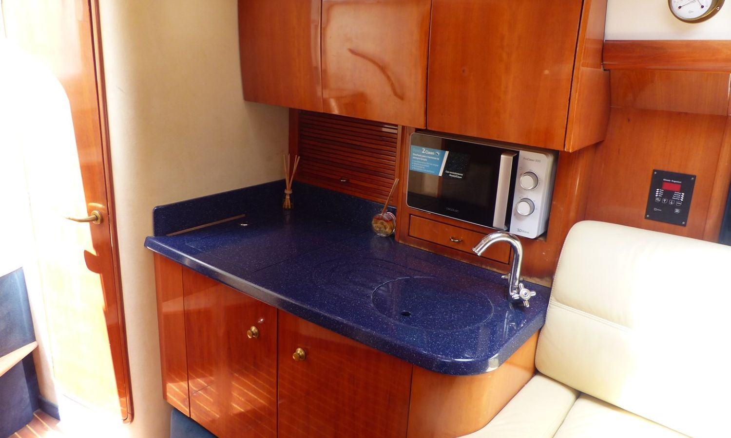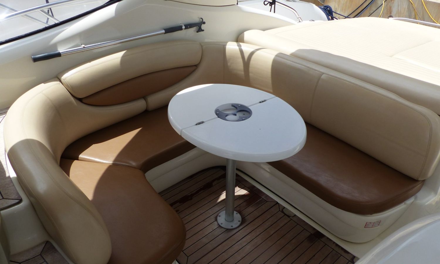 Propulseur d'étrave - Correcteurs d'assiette - Prise de quai 220 V. - Chargeur de batterie - Cockpit et plateforme de bain en teck - Barbecoue de cockpit - Réfrigérateur - Guideau électrique - Coussins de bain de soleil avant - Douchette arrière - Table de cockpit - Coomandes électroniques - Gps/Plotter/Sondeur - Indicateur d'angle de barre - Compas - Vhf -Equipement audio - Wc marin avec réservoir d'eaux noires - Douche - Cuisine électrique - Evier - Micro-ondes - Arceau radar repliable hydrauliquement - Antifouling.Description du bateau