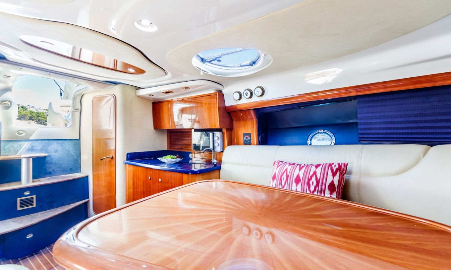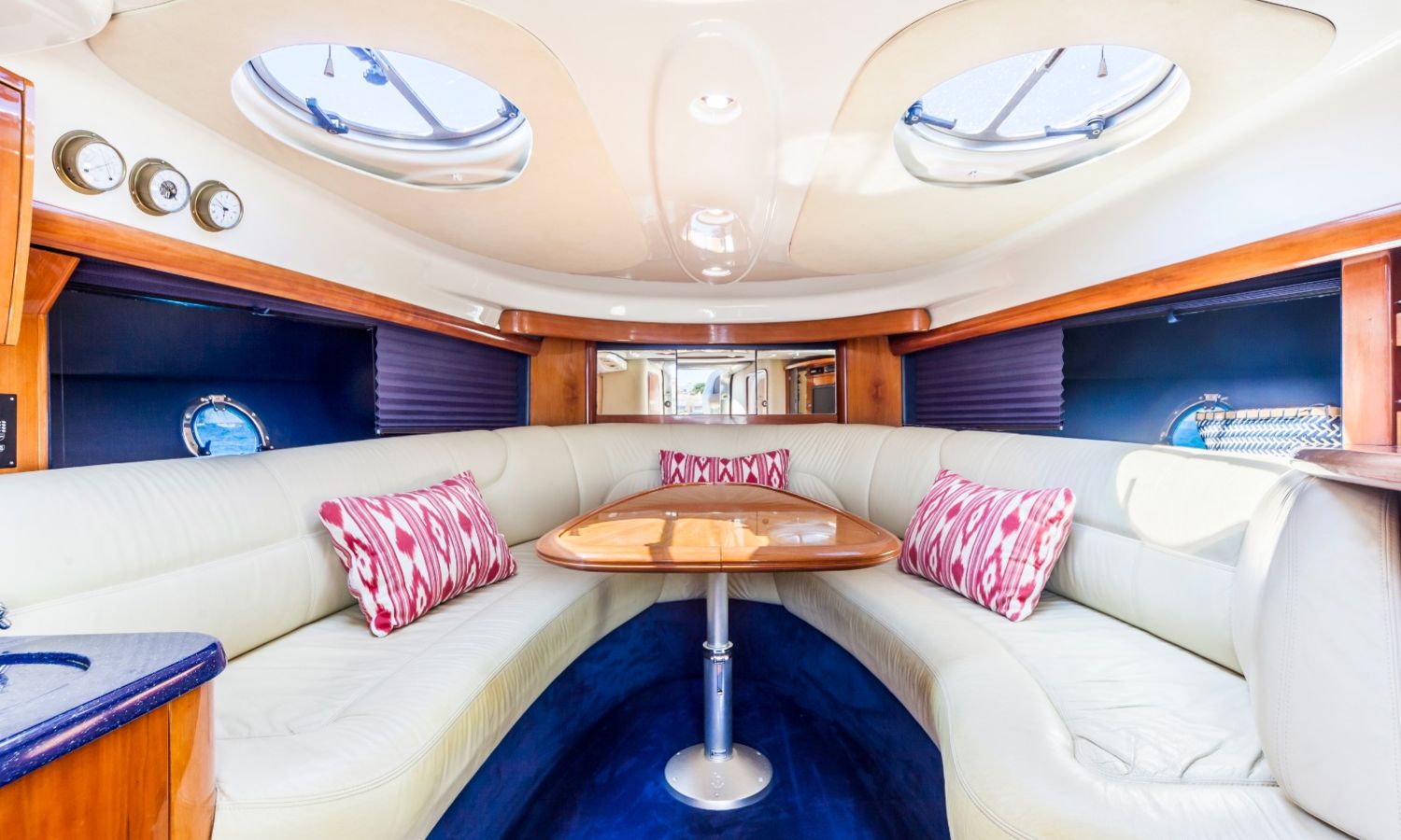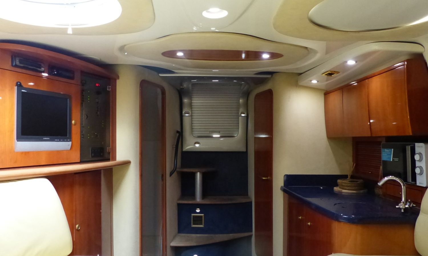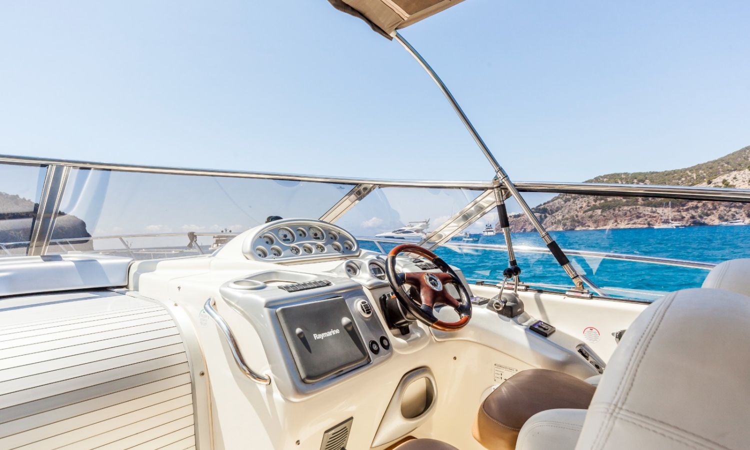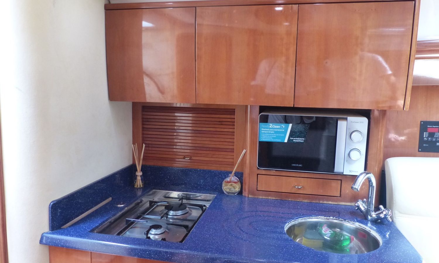 Propulseur d'étrave - Correcteurs d'assiette - Prise de quai 220 V. - Chargeur de batterie - Cockpit et plateforme de bain en teck - Barbecoue de cockpit - Réfrigérateur - Guideau électrique - Coussins de bain de soleil avant - Douchette arrière - Table de cockpit - Coomandes électroniques - Gps/Plotter/Sondeur - Indicateur d'angle de barre - Compas - Vhf -Equipement audio - Wc marin avec réservoir d'eaux noires - Douche - Cuisine électrique - Evier - Micro-ondes - Arceau radar repliable hydrauliquement - Antifouling.Description du bateau