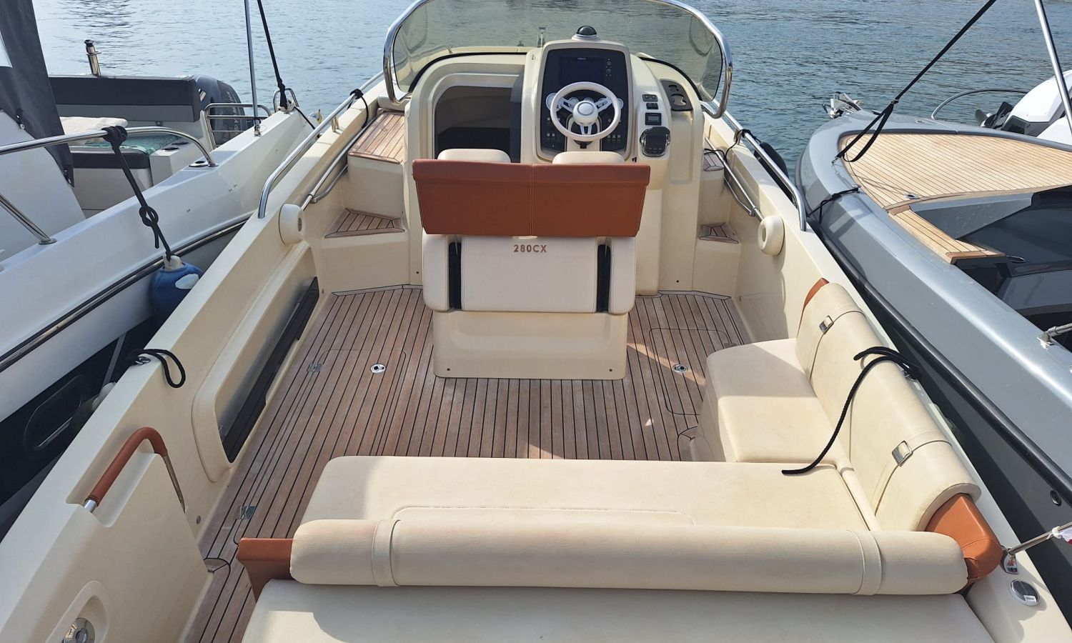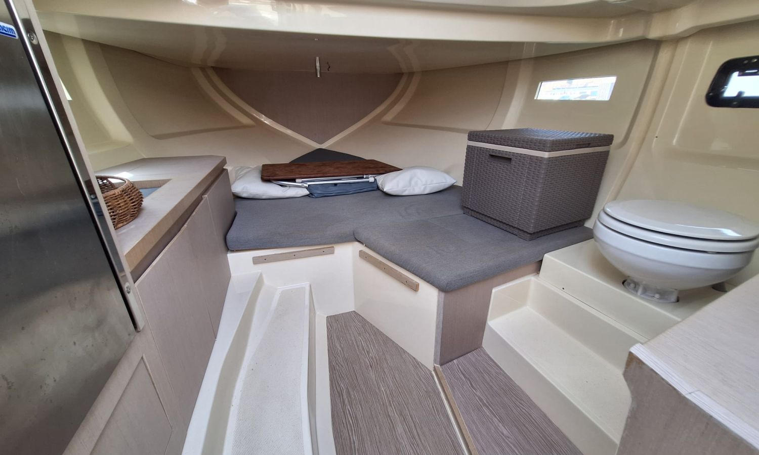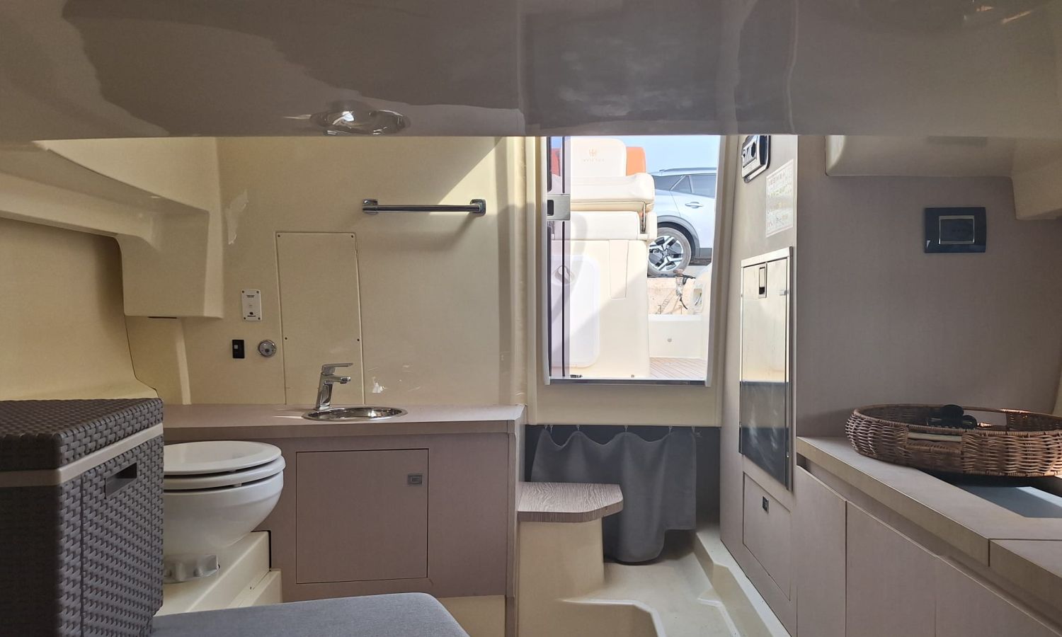 Flaps de réglage électriques - Guideau électrique - Bain de soleil de proue - Toit bimini - Douche de poupe - Gps/Plotter/Sondeur - Chargeur de batterie - Prise d'eau à bâbord - Propulseur d'étrave - Teck - Réfrigérateur - Toilettes marines - Cabine - AntifoulingDescription du bateau