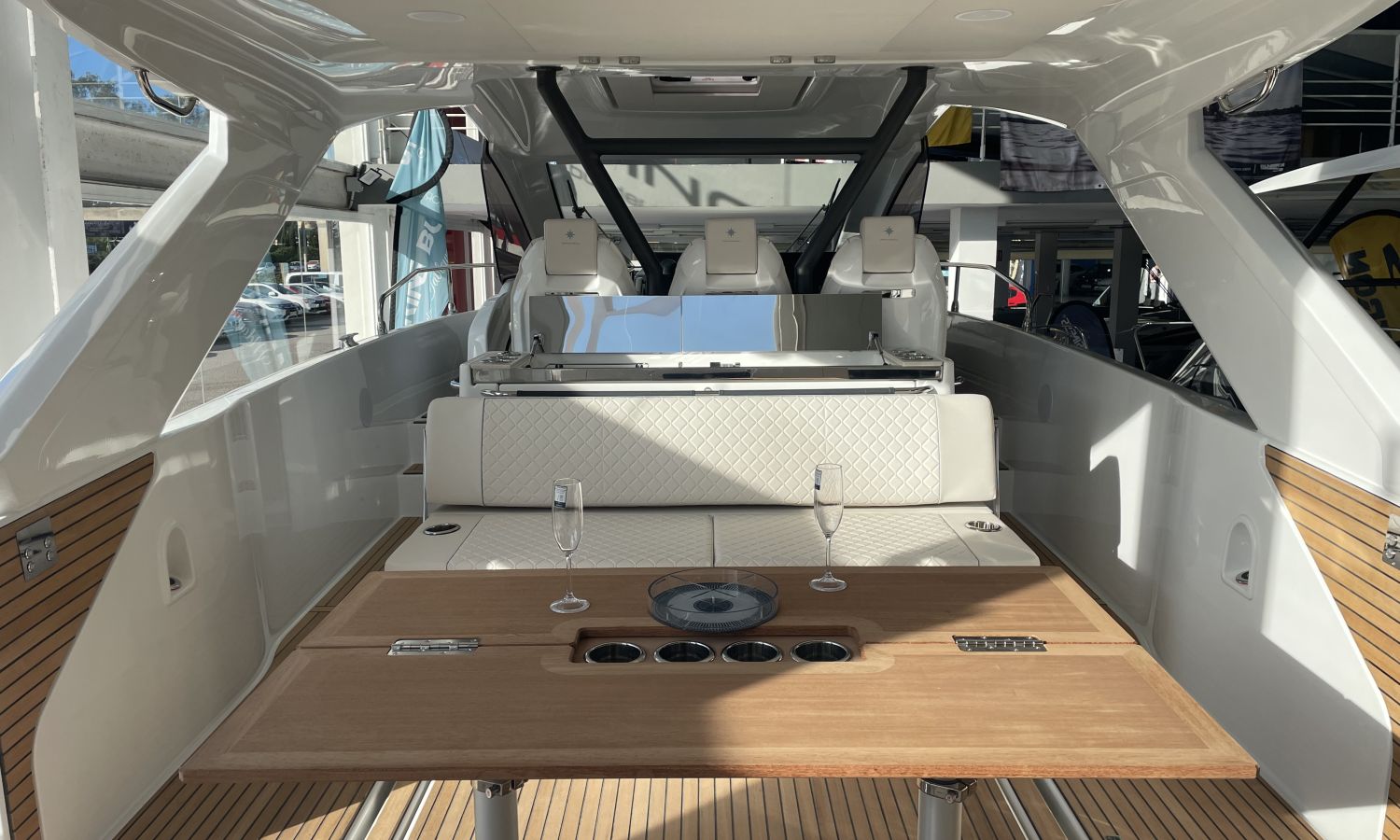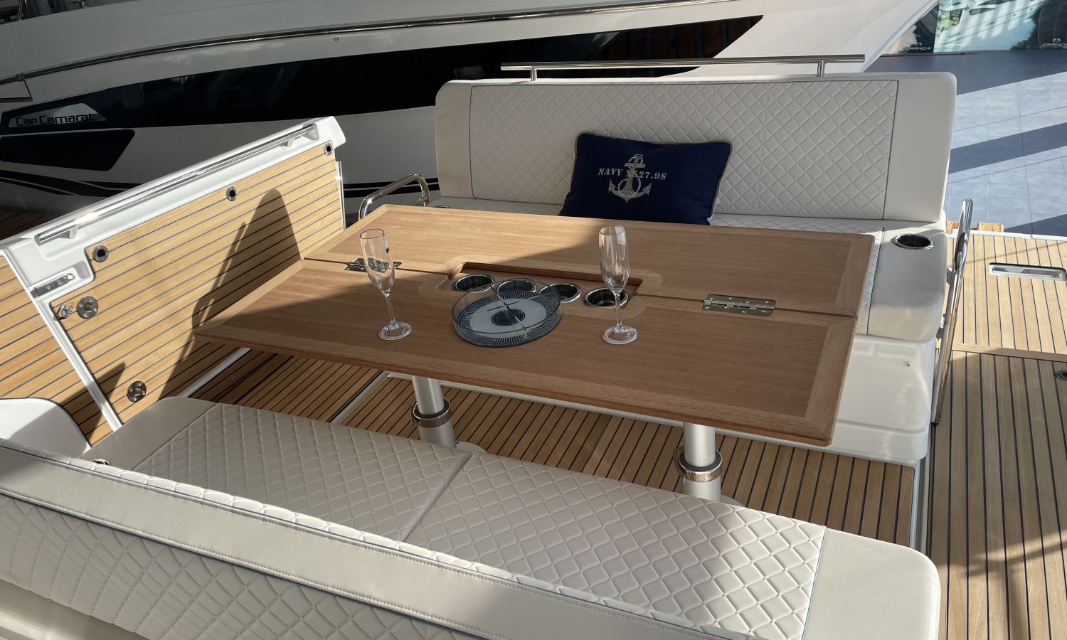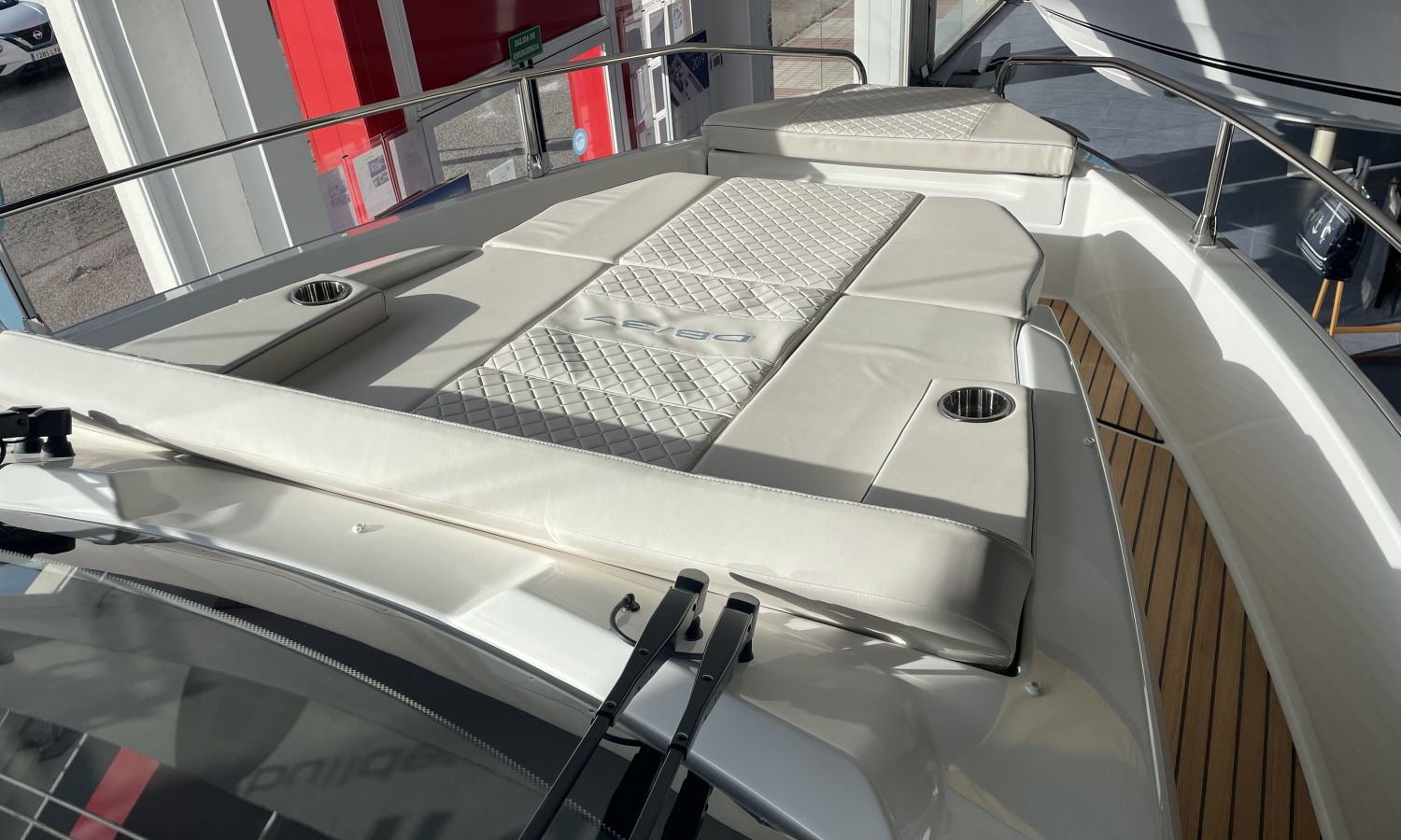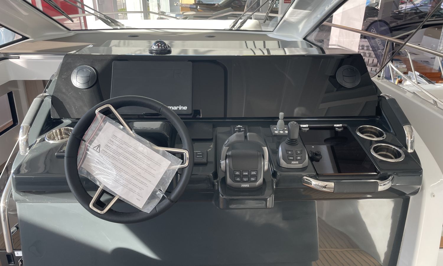 Joystick - Version 2 Cabines + 1 salle de bain - Version Sportop - Kit d’amarrage - Kit ancrage en acier inoxydable - Niveau équipement Premiere - Pack Confort - Four Micro-ondes - Climatisation intérieure 16000 BTU - Batterie supplémentaire 140A - Convertisseur 2000VA - Propulseur avant - Rallonge pour prise de quai 220V - Volets électriques - Échelle de bain pour plates-formes latérales - Coussins cockpit Ice Blue - Table de baignoire en bois avec pieds télescopiques + bain de soleil - Bain de soleil à l’avant Ice Blue - Supplément bain de soleil à l’avant Ice Blue Réfrigérateur dans le meuble baignoire - Teck dans la baignoire et passerelle à l’avant - Fer à repasser dans la cuisine baignoire - Pack électronique Raymarine amélioré - Transport Chantier-Costa Brava - Peinture Antifouling - Préparation, montage, lancement et essais en mer..Description du bateau
