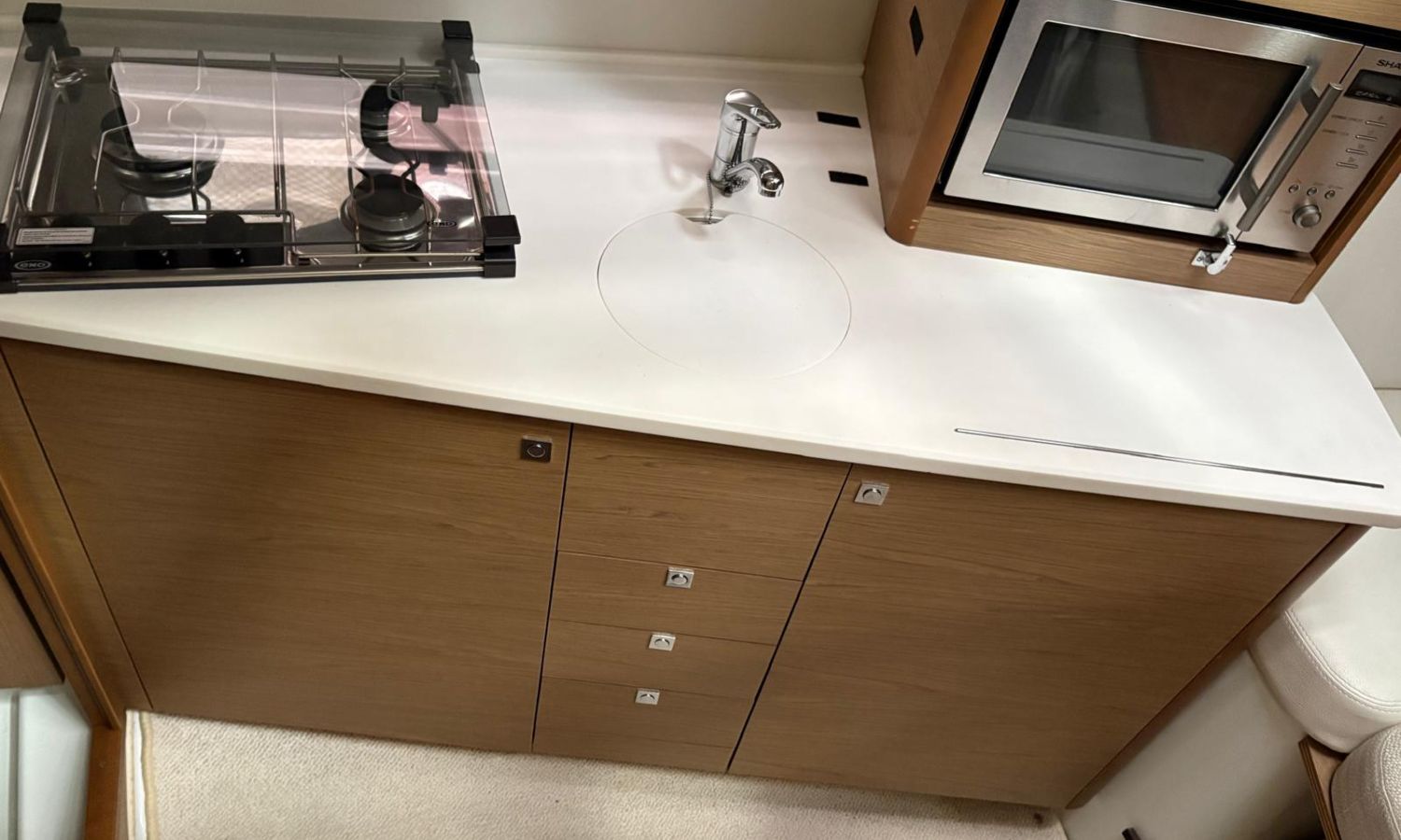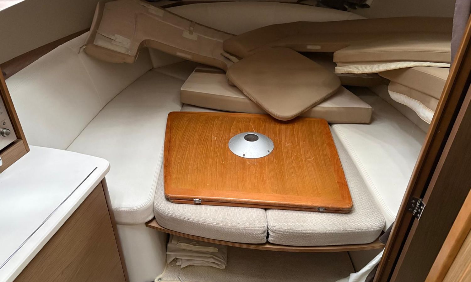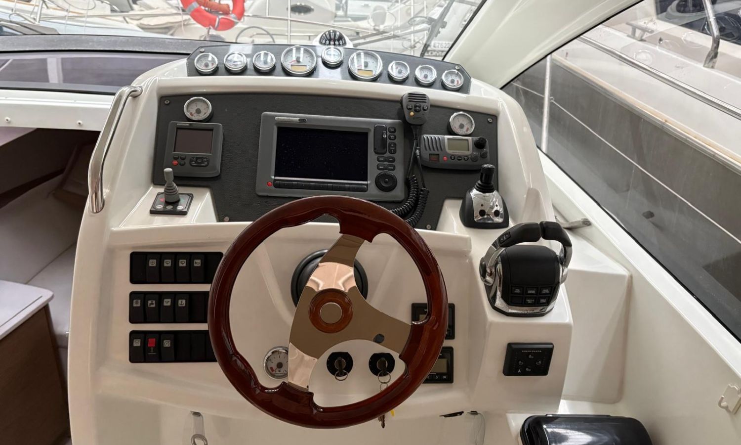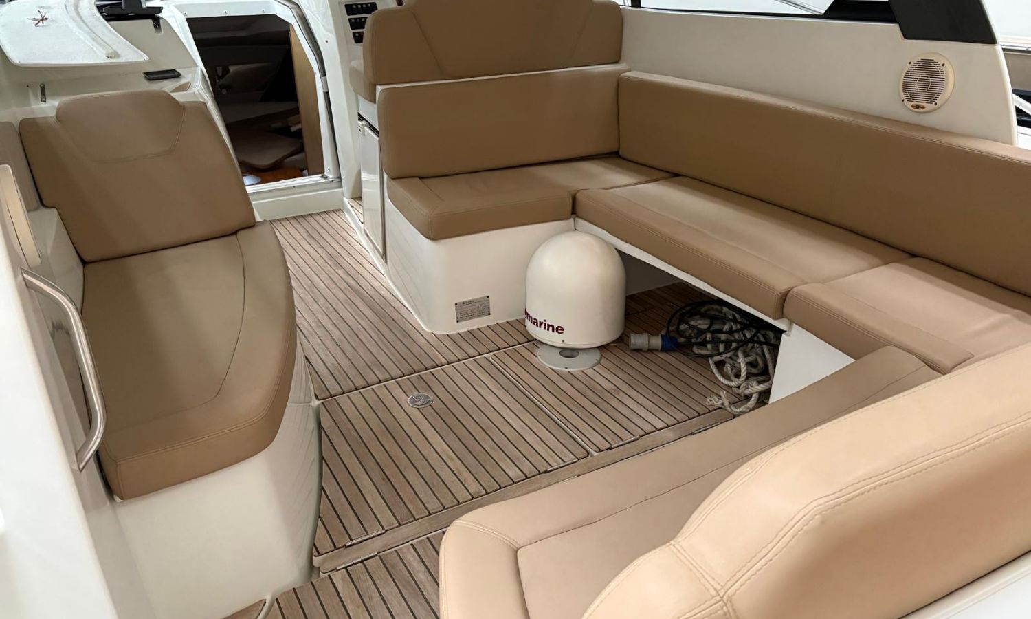 Propulseur d'étrave - Flaps - Prise quai 220 v - Chargeur de batterie - Eau chaude - Teck sur plateforme de bain - Réfrigéreteur dans le cockpit - Guindeau électrique - Coussins de bain de soleil avant - Douchette arrière - Table de cockpit - Commandes électroniques - Gps/Plotter/Sondeur - Pilote automatique - Joystick - Boussole - Vhf - Equipement audio - Tv satellite - Deux cabines - WC électrique avec réservoir d'eaux noires - Cuisine à gaz - Evier - Micro-ondes - Réfrigérateur.