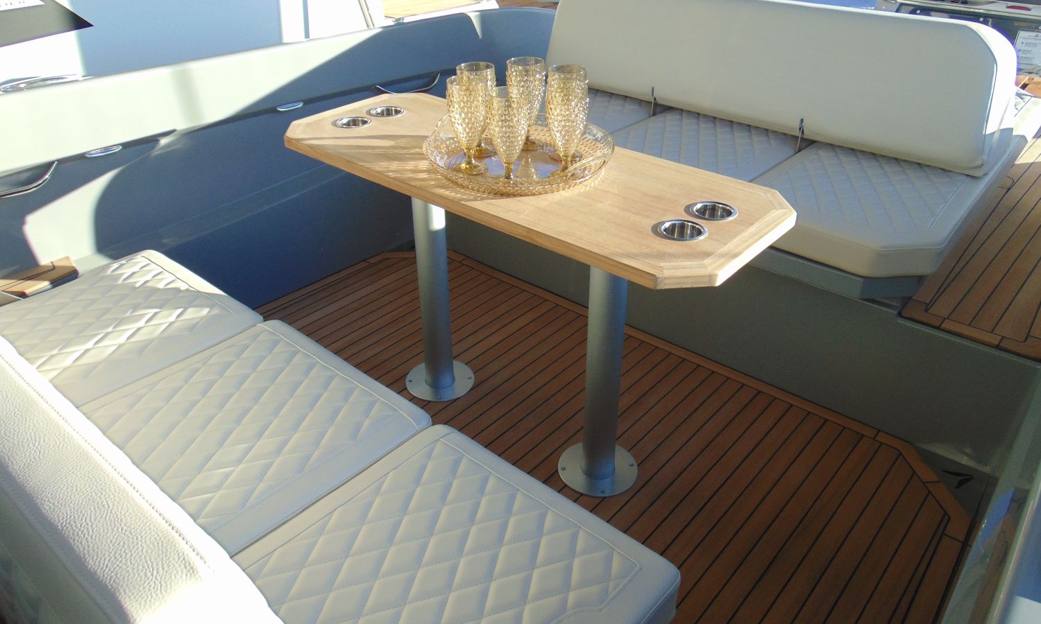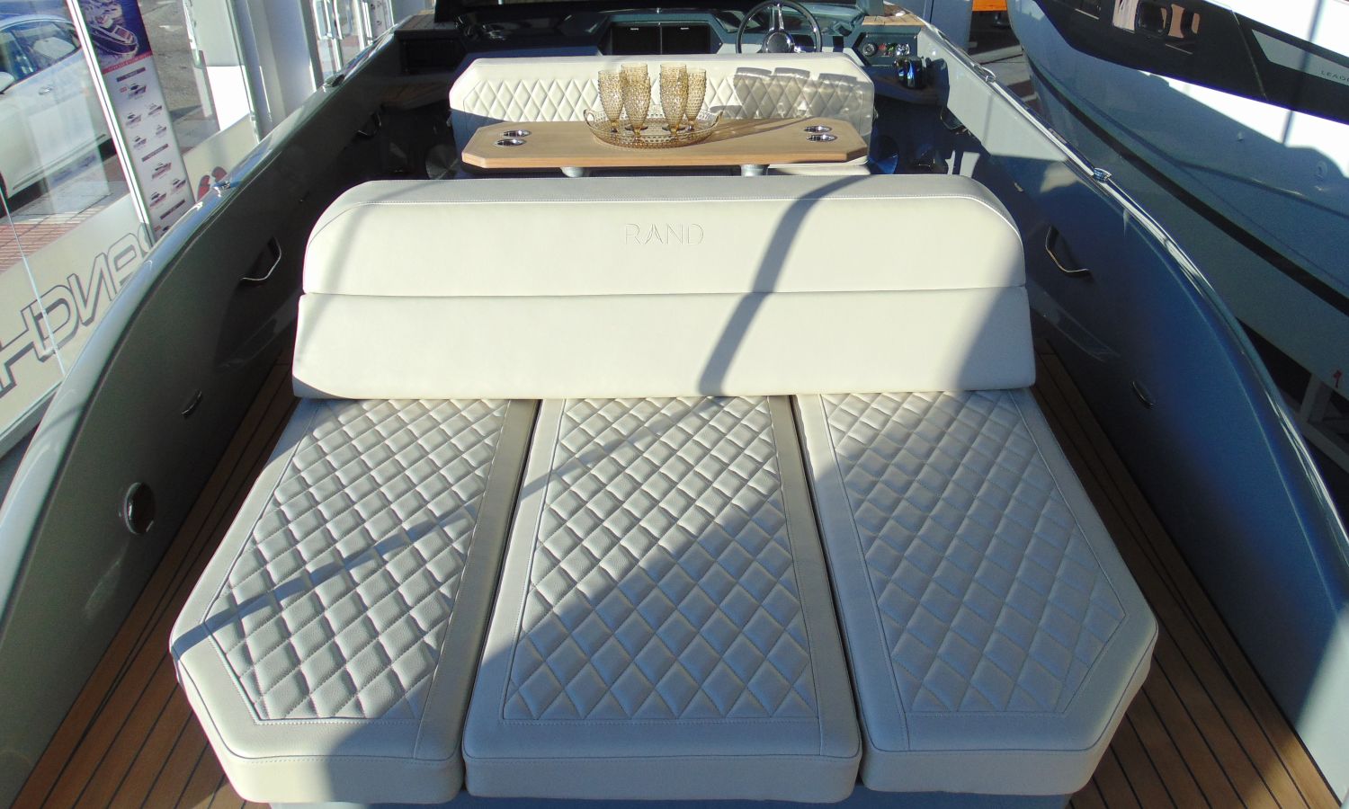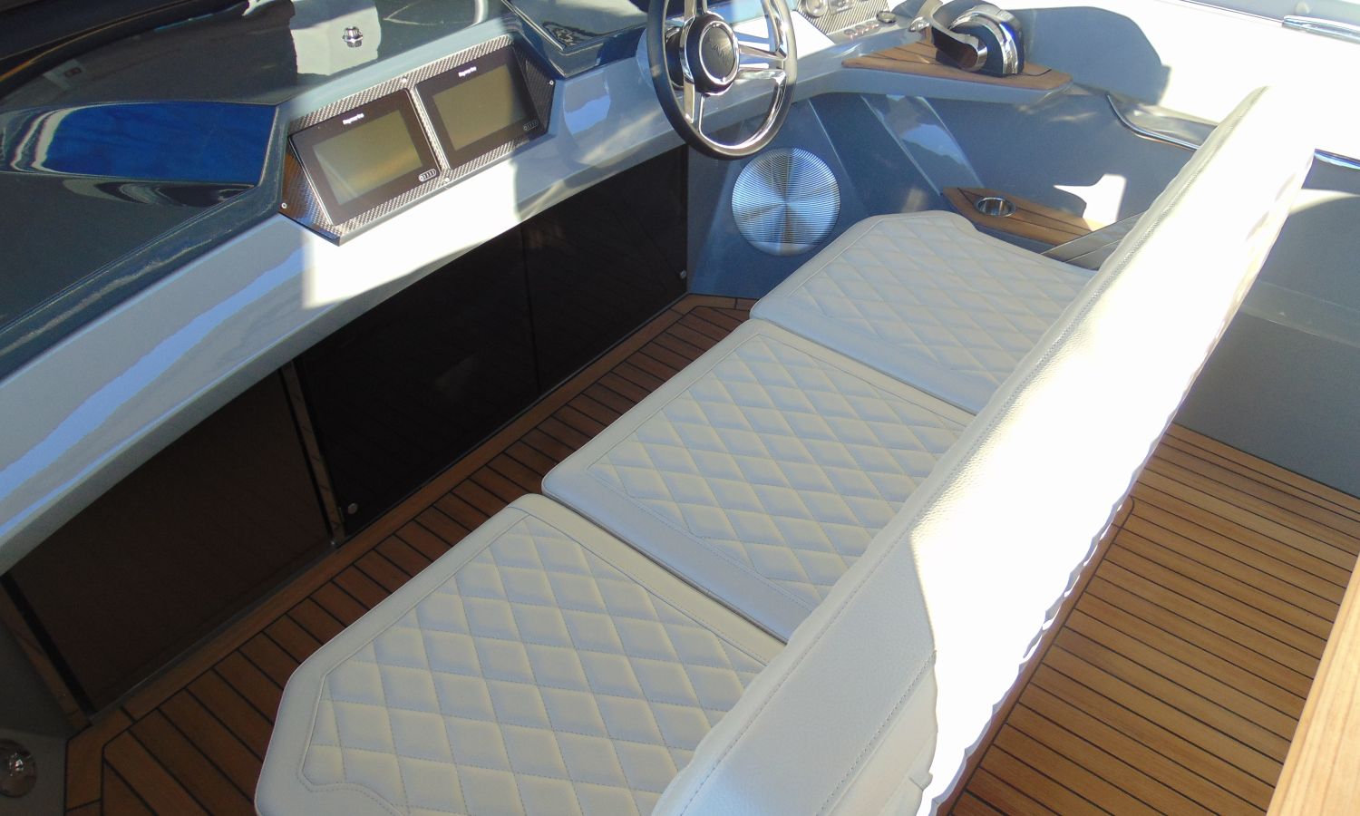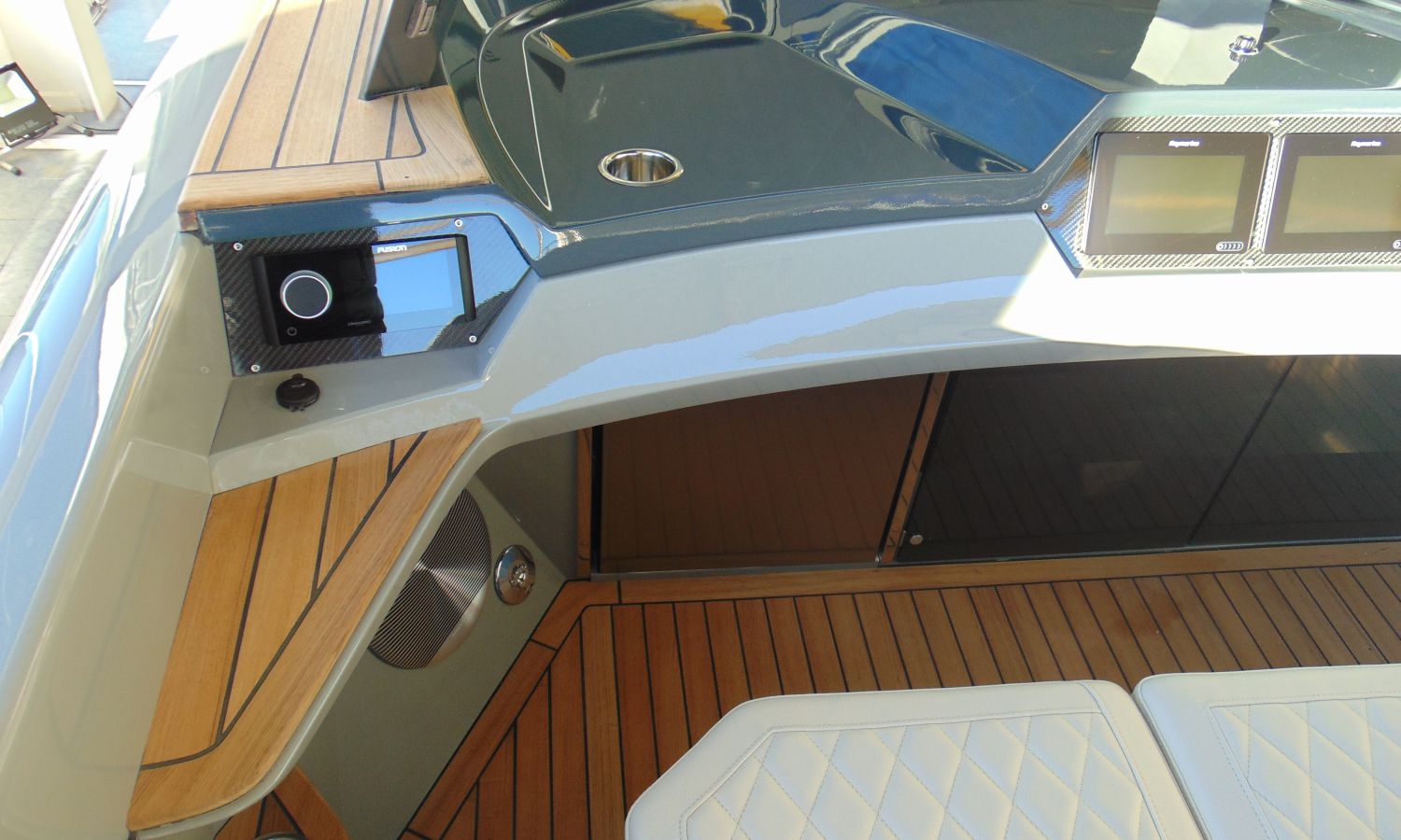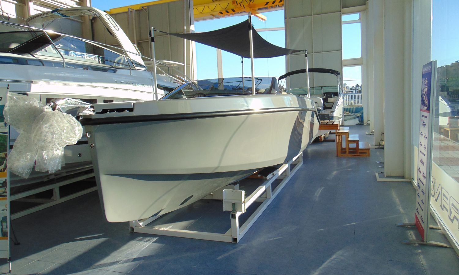 COQUE COULEUR GRISE SKI - SELLERIE EN CUIR DIAMANT - GUINDEAU ELECTRIQUE + KIT DE MOUILLAGE - DEUX ECRANS RAYMARINE 7" SUR LE TABLEAU DE BORD AVEC SYSTEME DOMOTIQUE - CROCHET A SKI - PORTE-VERRE - DOUCHE DE COCKPIT - FEUX A LEDS DANS LE COCKPIT - DEFENSES - ECHELLE DE BAIN PREMIUM - REFRIGERATEUR LUXE - TAUD DE MOUILLAGE - CAPTEUR DE PROFONDEUR - CHARGEUR DE BATTERIE – AUVENT DE TYPE HAIMA - PROPULSEUR D'ETRAVE - SYSTEME AUDIO B&O - EXTINCTEUR AUTOMATIQUE - TECK SUR PONT ET PLATEFORME DE BAIN - TRANSPORT CHANTIER NAVAL-COSTA-BRAVA.Description du bateau