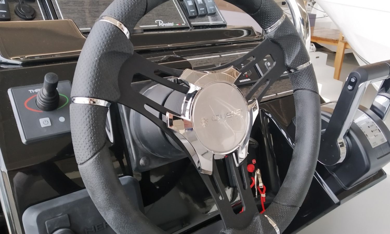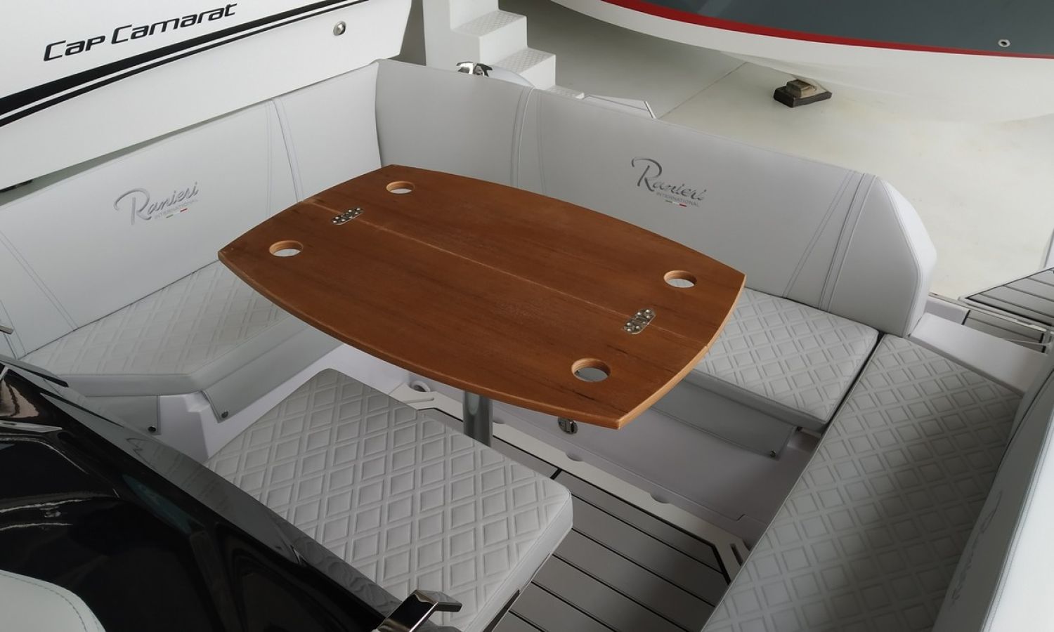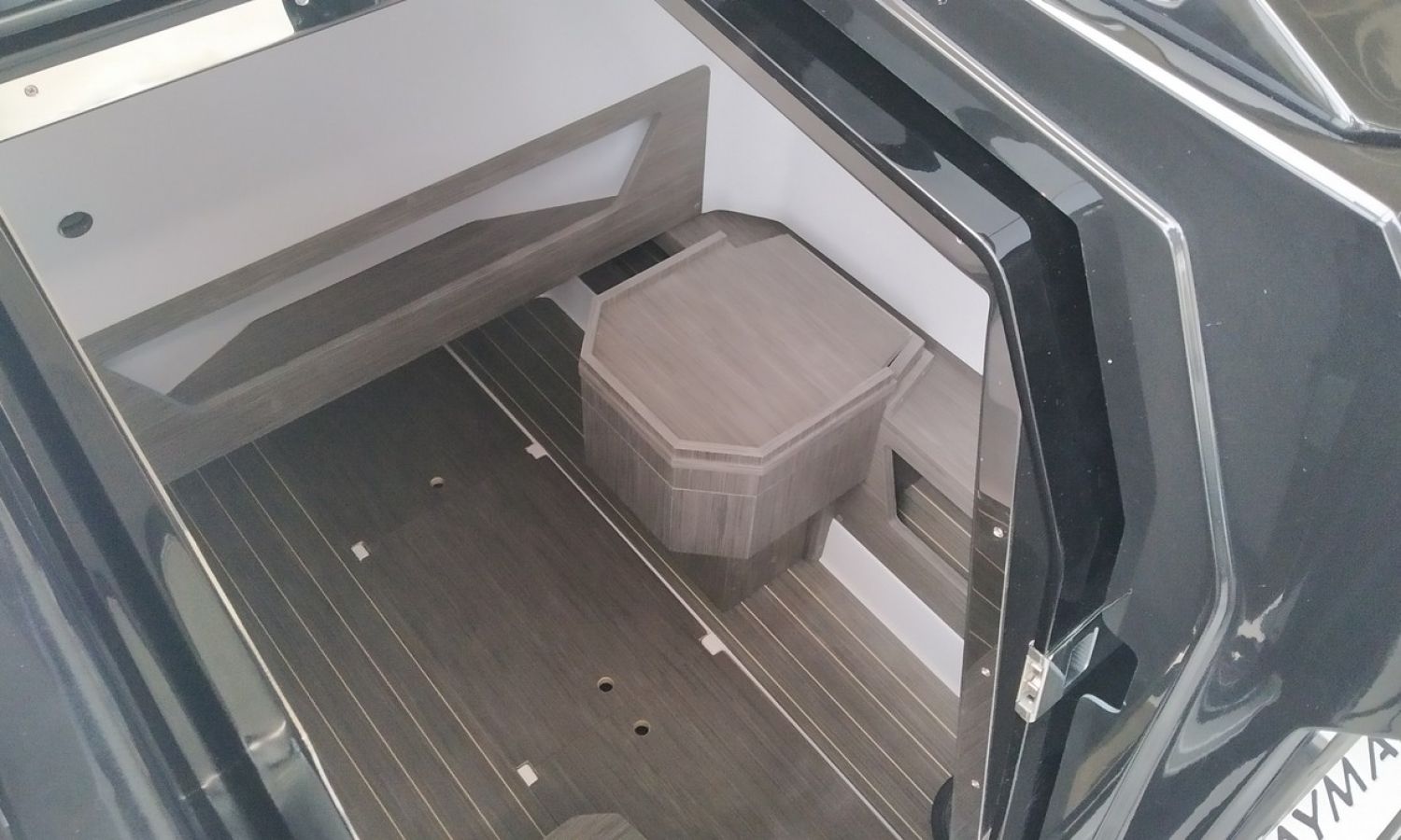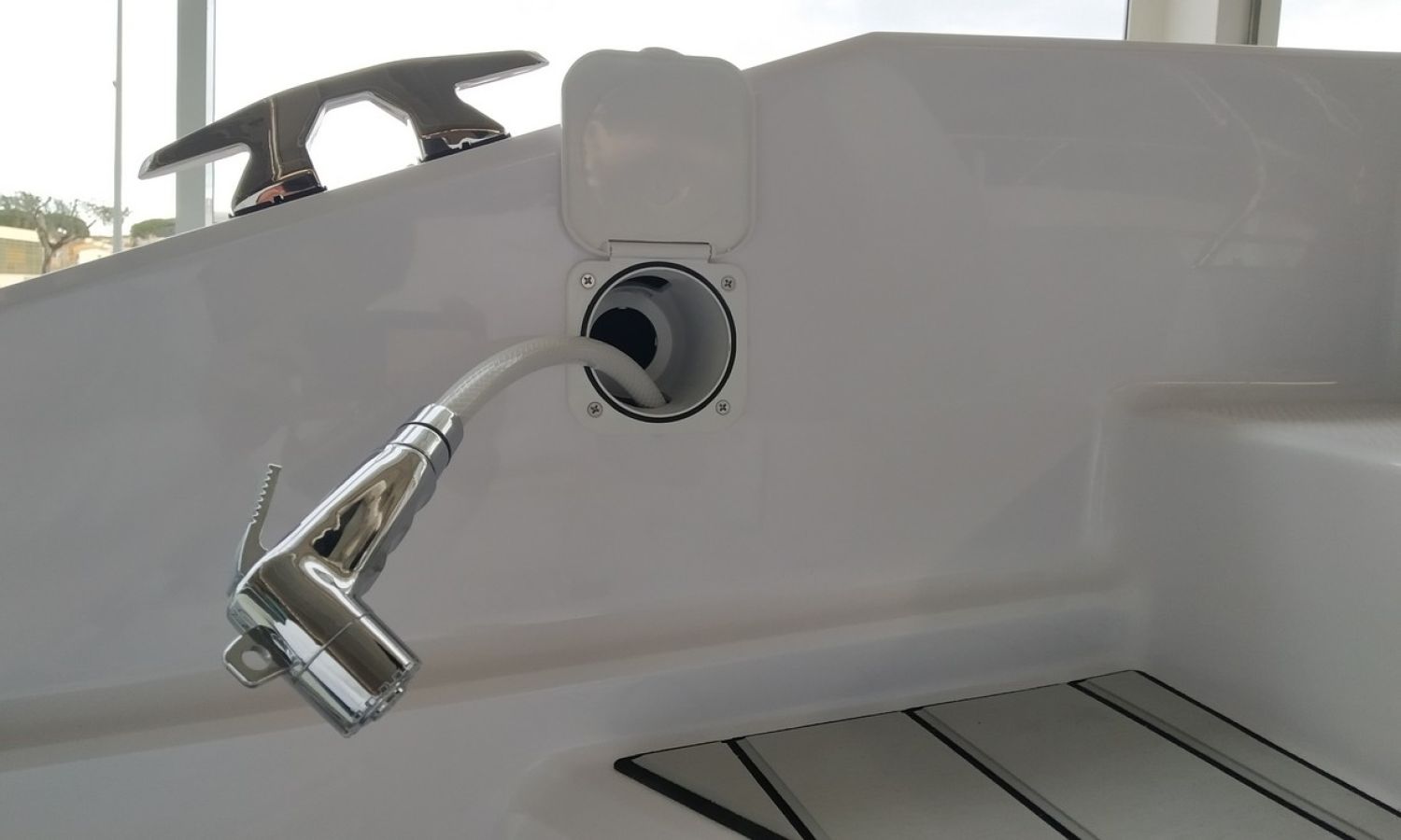 Compas encastré - Couleur gelcoat console et siège - Compte-chaîne - Propulseur d'étrave - Réfrigérateur extérieur en inox - Installation pour batterie additionnelle - Installation stéreo avec 2 haut-parleurs et Bluetooth - Kit mât de ski - Kit bain de soleil à poupe - Éclairage LED dans le cockpit - Cockpit en Seadeck - Seadeck sur les plateformes de bain - Prise de quai 220 V - Roll-bar rabattable en inox avec double taud soleil - Siège arrière pliable - Tapisserie Luxury - Table de cockpit en teck - Taud console et siège - WC électrique avec réservoir d'eaux sales - Pre-rigging et propulseurs Honda - Montage bi-moteur -Transport chantier naval à Costa Brava.Description du bateau