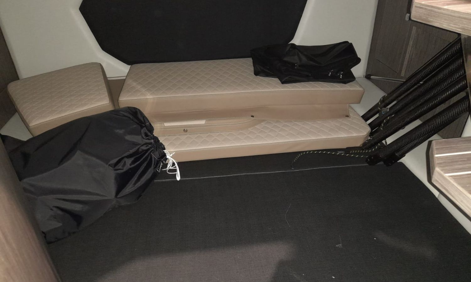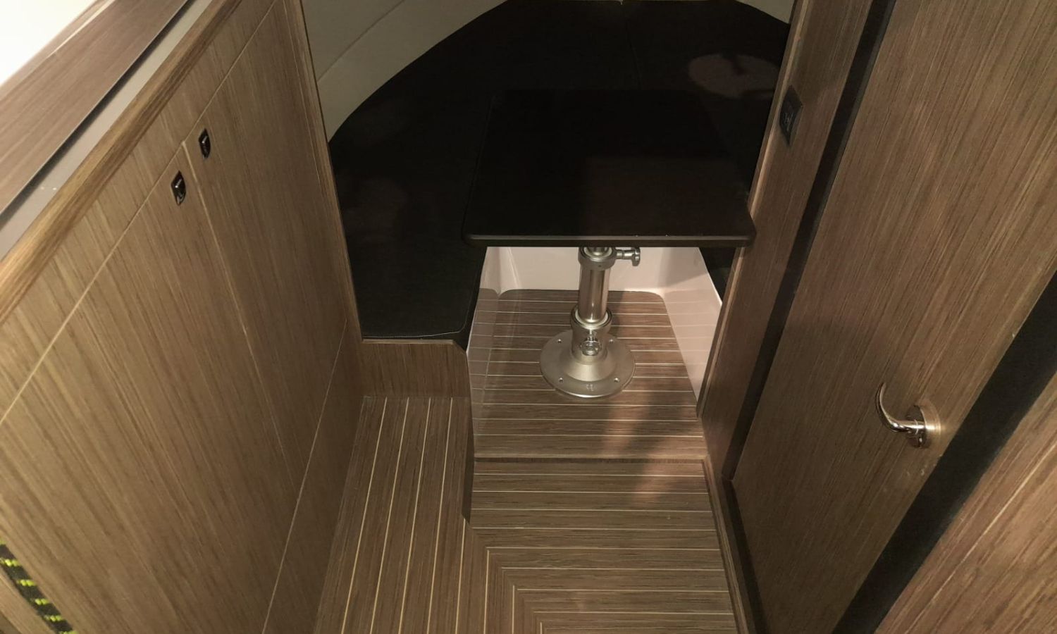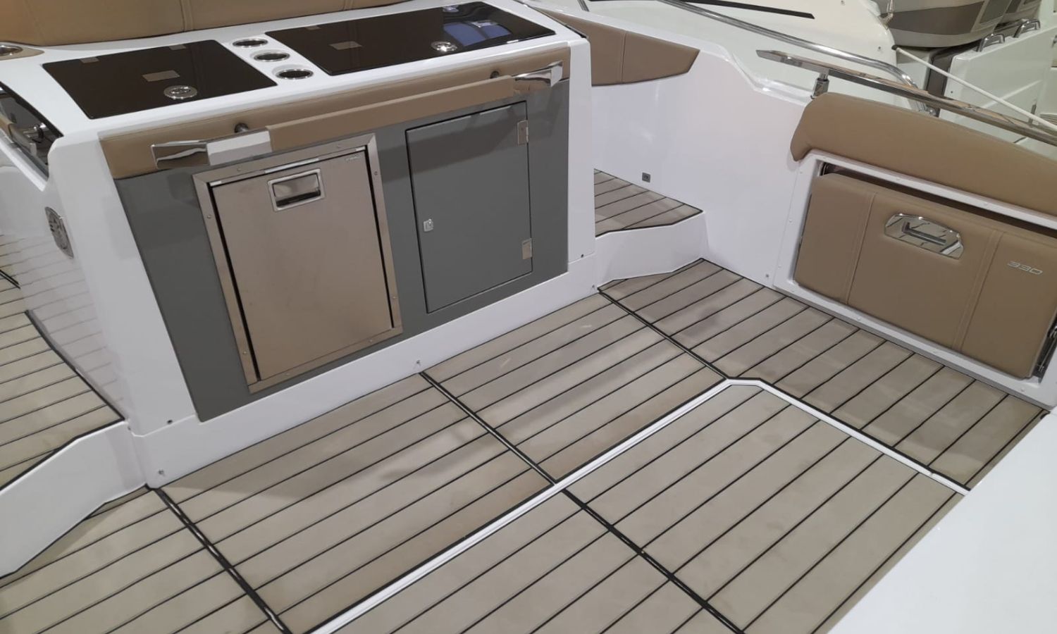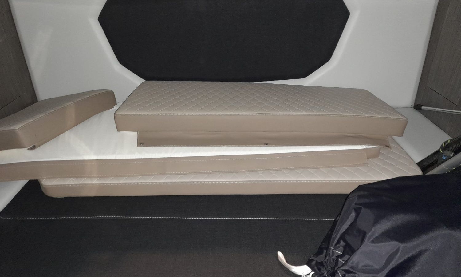 Taud soleil - Douche à poupe - Plateforme de bain avec échelle - Seadek - Bain de soleil à l'arrière - Coussins bain de soleil à l'avant - Table de cockpit - Meuble-bar avec évier - Réfrigérateur dans le cockpit 12 V - Cuisine à gaz - Chauffe eau - Guindeau électrique avec ancre et chaîne - GPS/Plotter/Sondeur - VHF - Commandes électroniques - Pilote automatique - Propulseur d'étrave - Équipement d'audio - Prise de quai 220 V - Propulseur d'étrave - Chargeur de batterie - WC électrique avec réservoir d'eaux sales - Cabine - Taud de mouillage - Anti-algues.Description du bateau