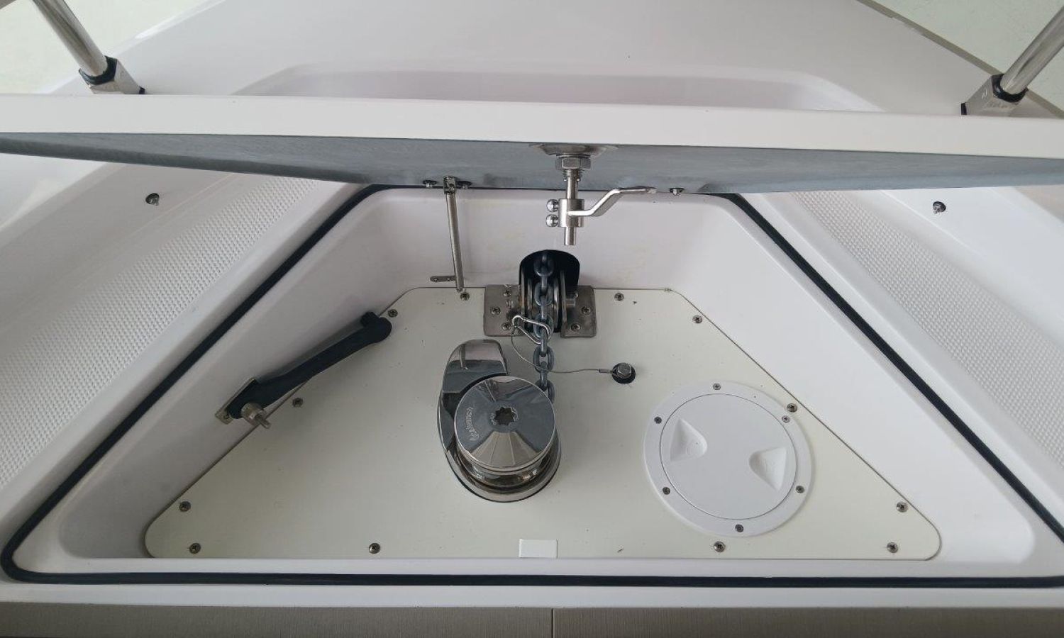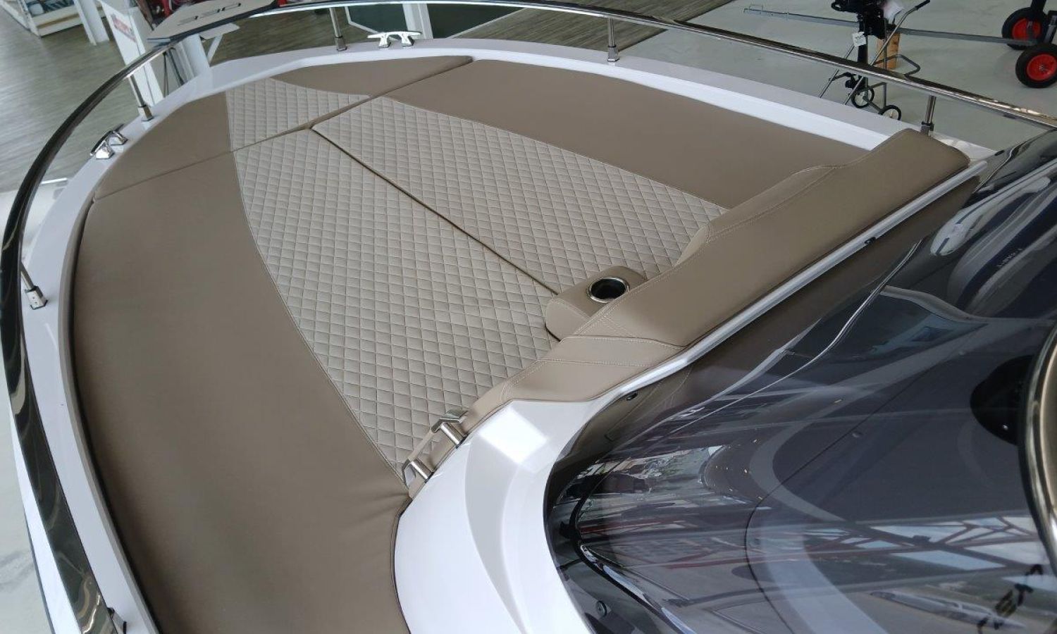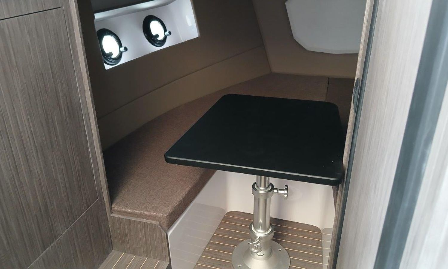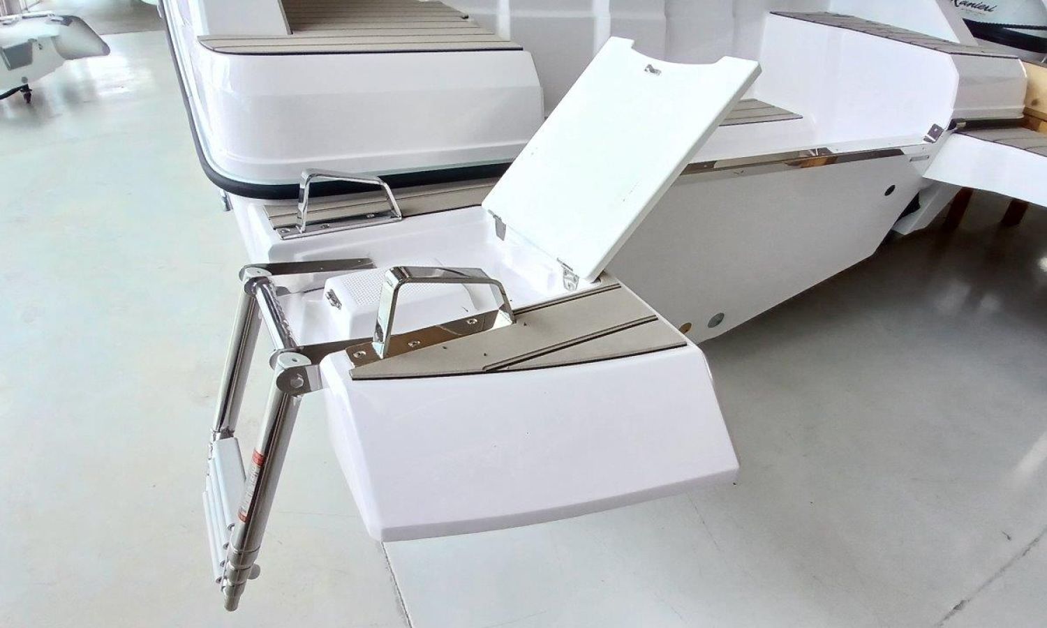 Couleur gris latéraux coque - Compte-mètres chaîne - Propulseur d'étrave - Four à micro-ondes avec inverter - Installation pour batterie additionnelle - Kit mât de ski - Prise de quai 220 V - Bancs latéraux pliables - Taud de mouillage - Taud soleil - Pre-rigging Suzuki électronique bi-moteur -Transport chantier naval à Costa Brava.Description du bateau