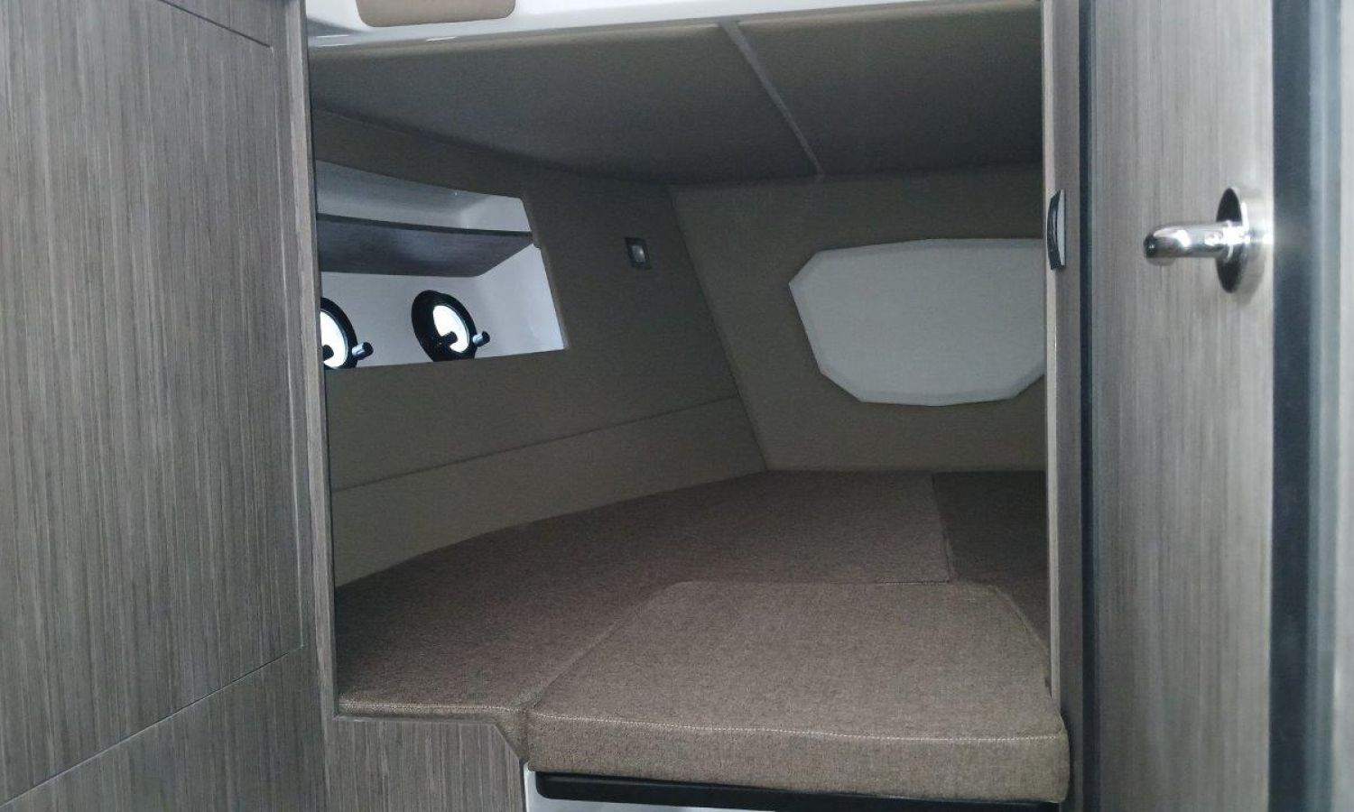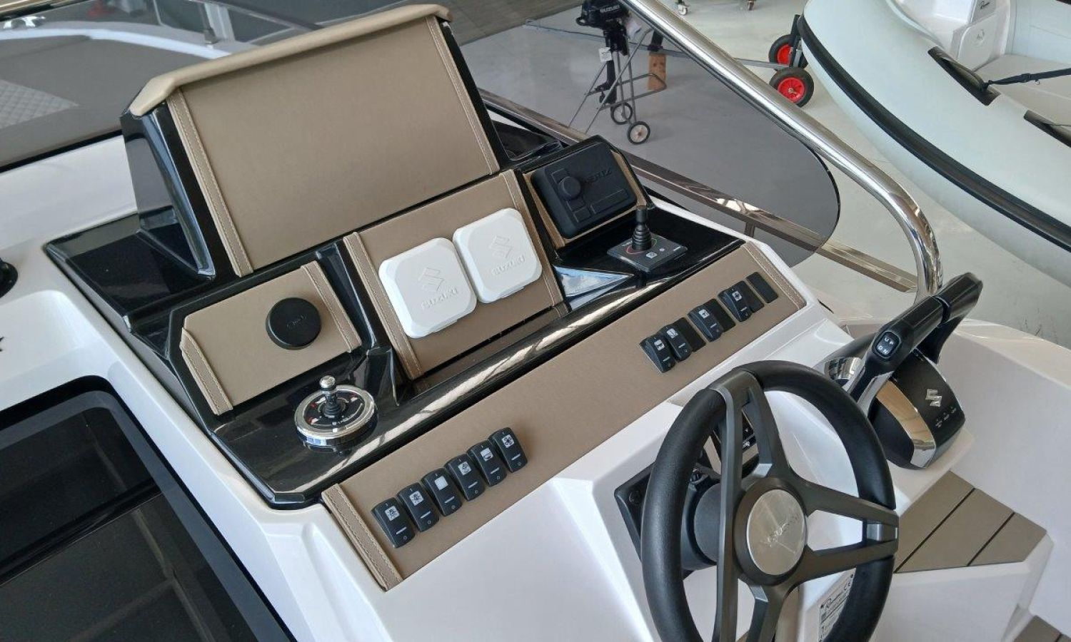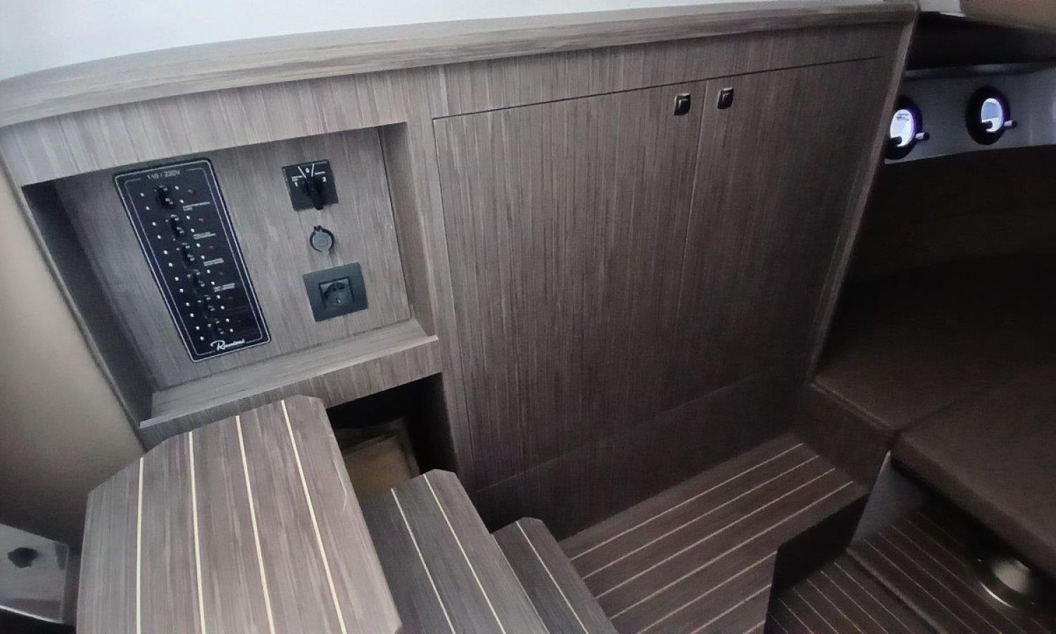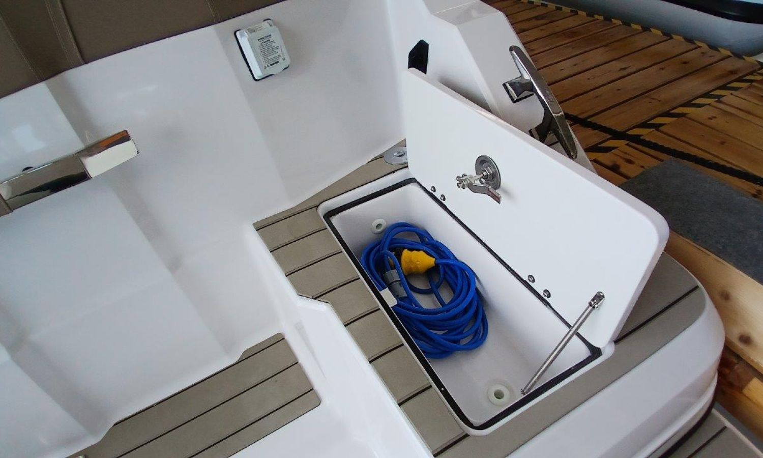 Couleur gris latéraux coque - Compte-mètres chaîne - Propulseur d'étrave - Four à micro-ondes avec inverter - Installation pour batterie additionnelle - Kit mât de ski - Prise de quai 220 V - Bancs latéraux pliables - Taud de mouillage - Taud soleil - Pre-rigging Suzuki électronique bi-moteur -Transport chantier naval à Costa Brava.Description du bateau