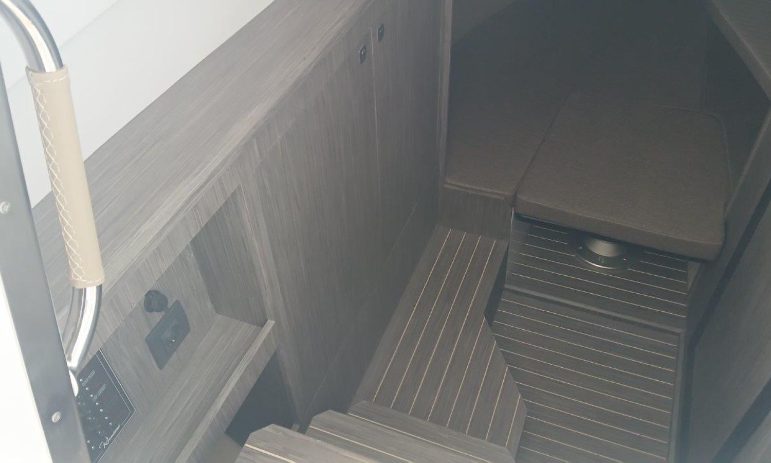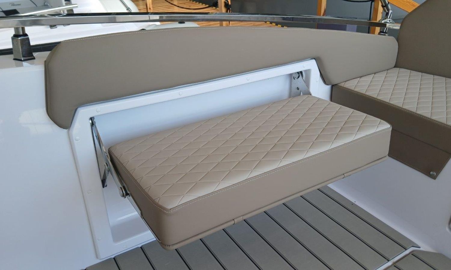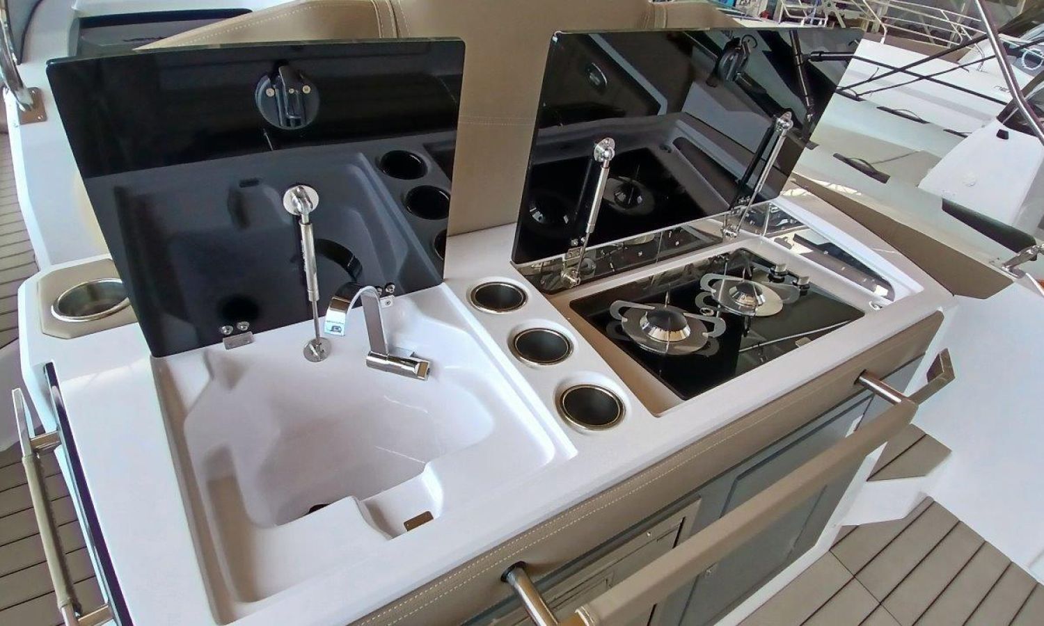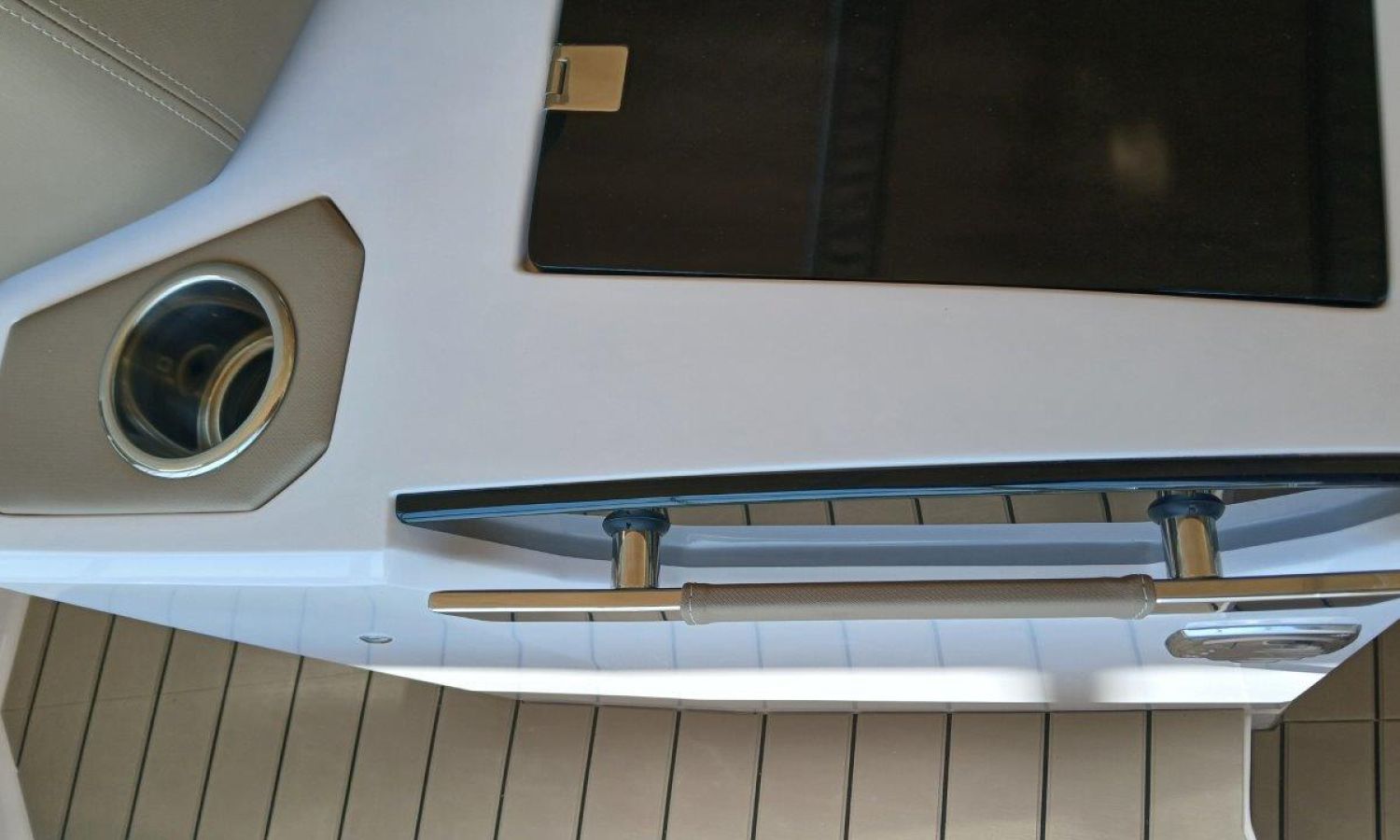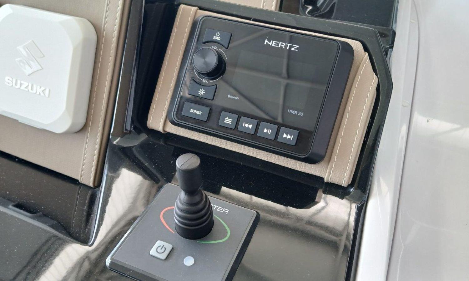 Couleur gris latéraux coque - Compte-mètres chaîne - Propulseur d'étrave - Four à micro-ondes avec inverter - Installation pour batterie additionnelle - Kit mât de ski - Prise de quai 220 V - Bancs latéraux pliables - Taud de mouillage - Taud soleil - Pre-rigging Suzuki électronique bi-moteur -Transport chantier naval à Costa Brava.Description du bateau