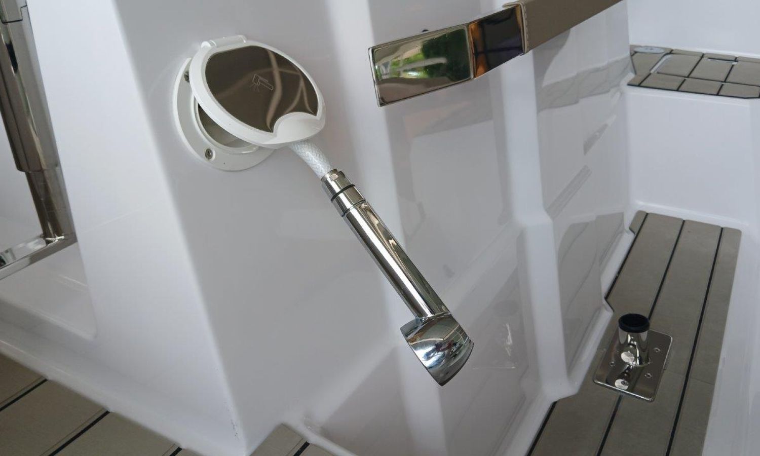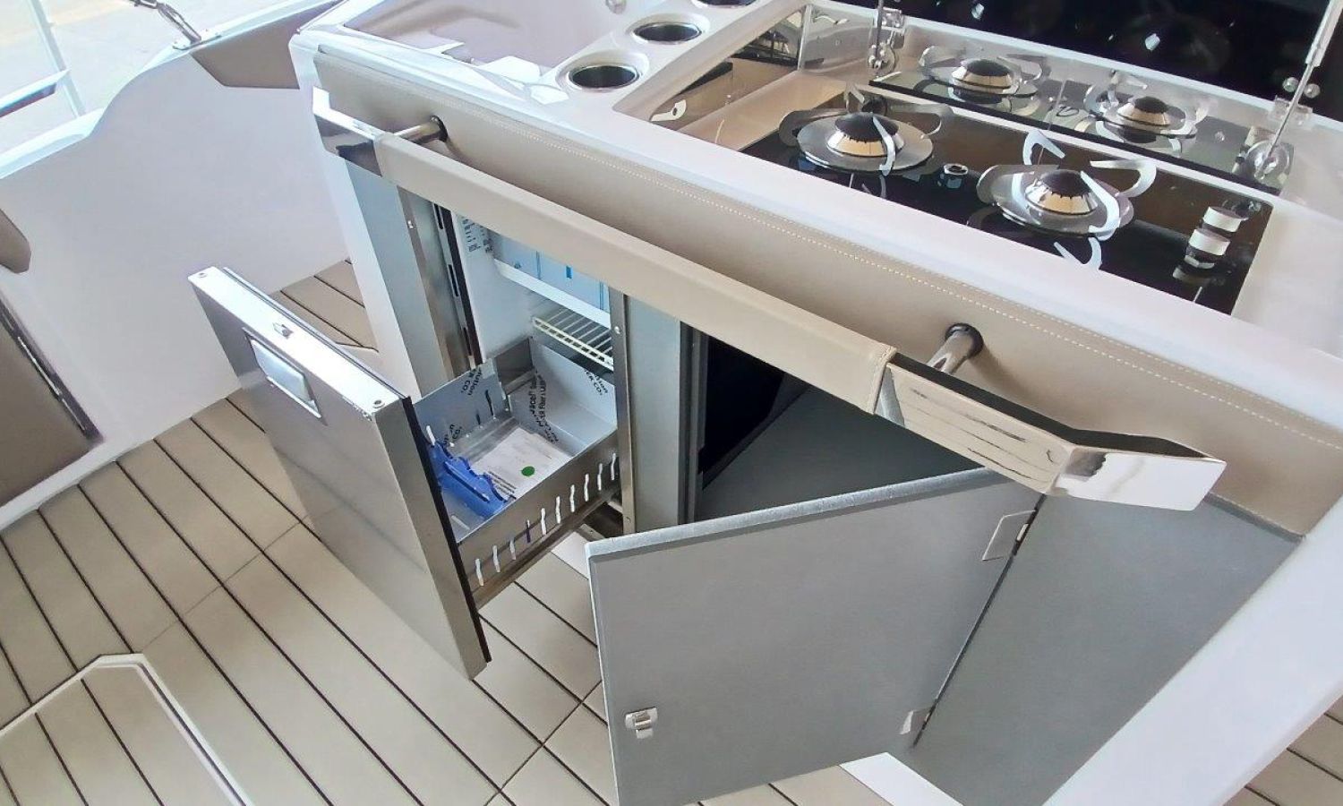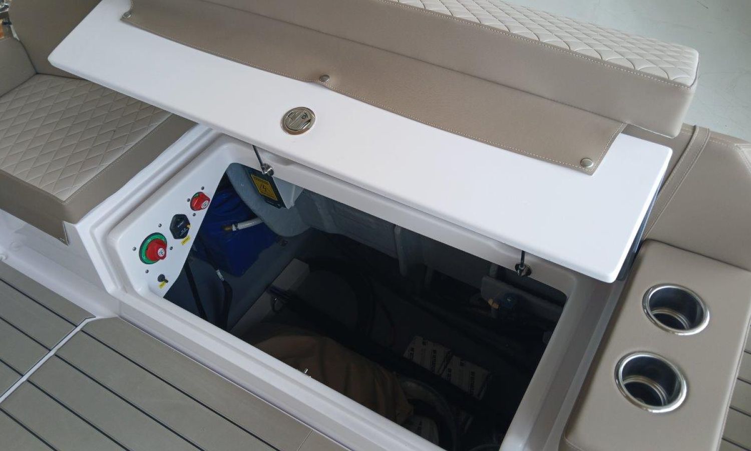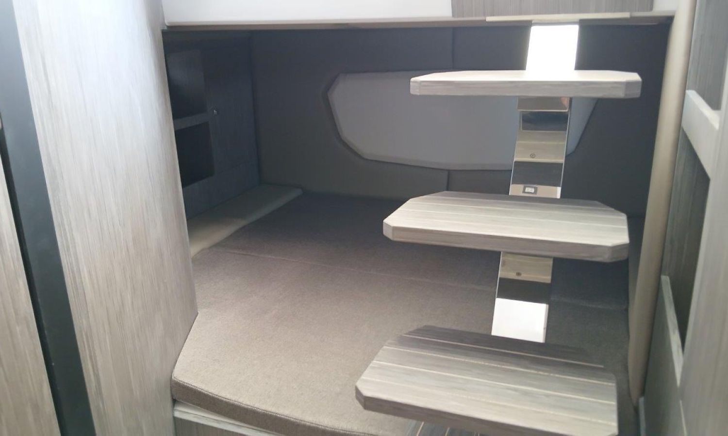 Couleur gris latéraux coque - Compte-mètres chaîne - Propulseur d'étrave - Four à micro-ondes avec inverter - Installation pour batterie additionnelle - Kit mât de ski - Prise de quai 220 V - Bancs latéraux pliables - Taud de mouillage - Taud soleil - Pre-rigging Suzuki électronique bi-moteur -Transport chantier naval à Costa Brava.Description du bateau