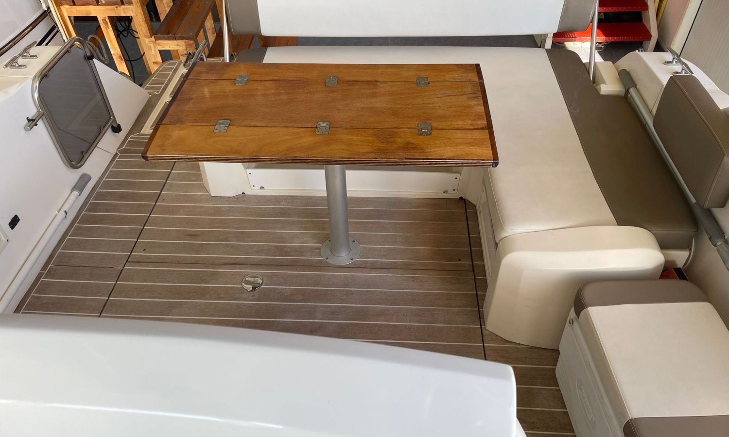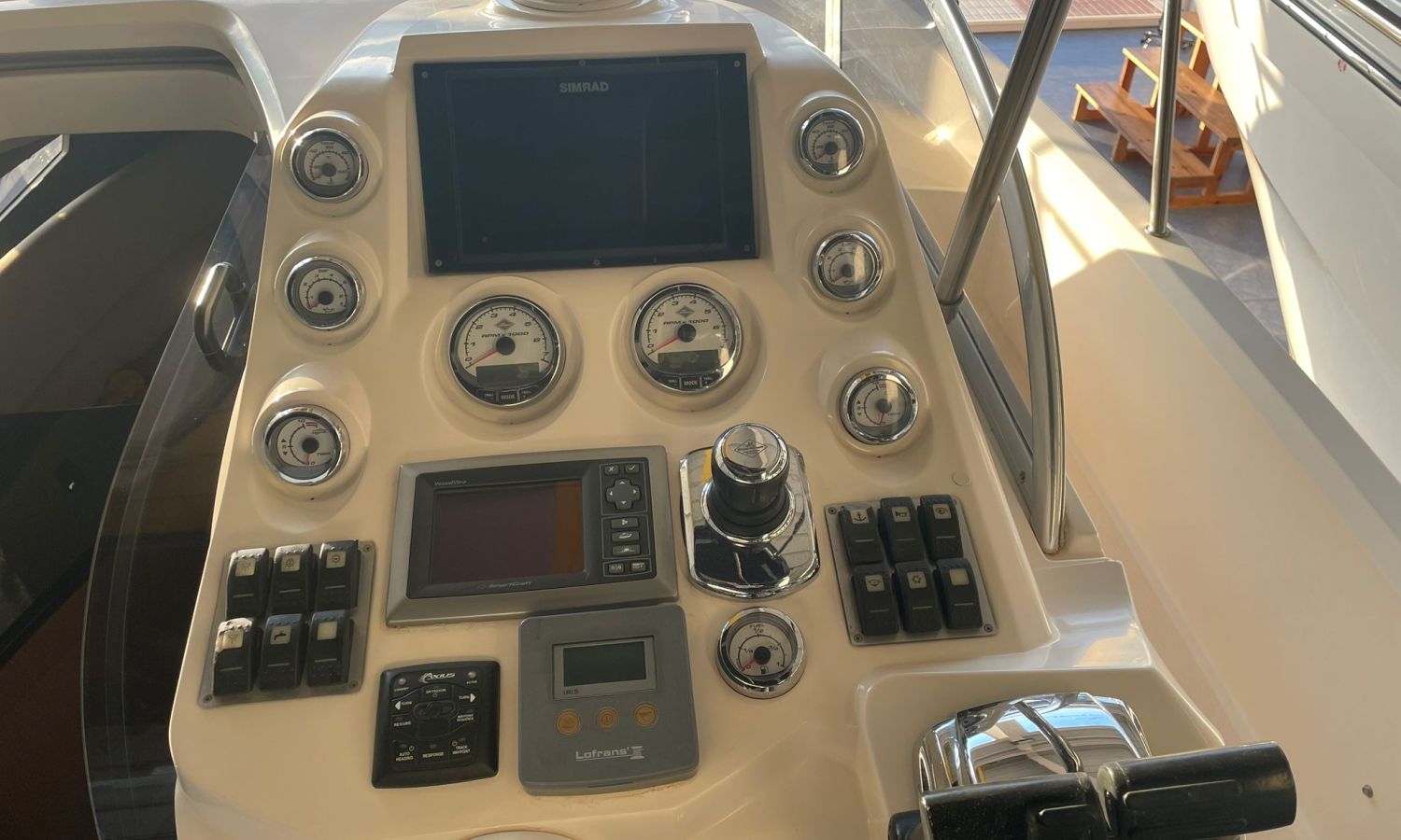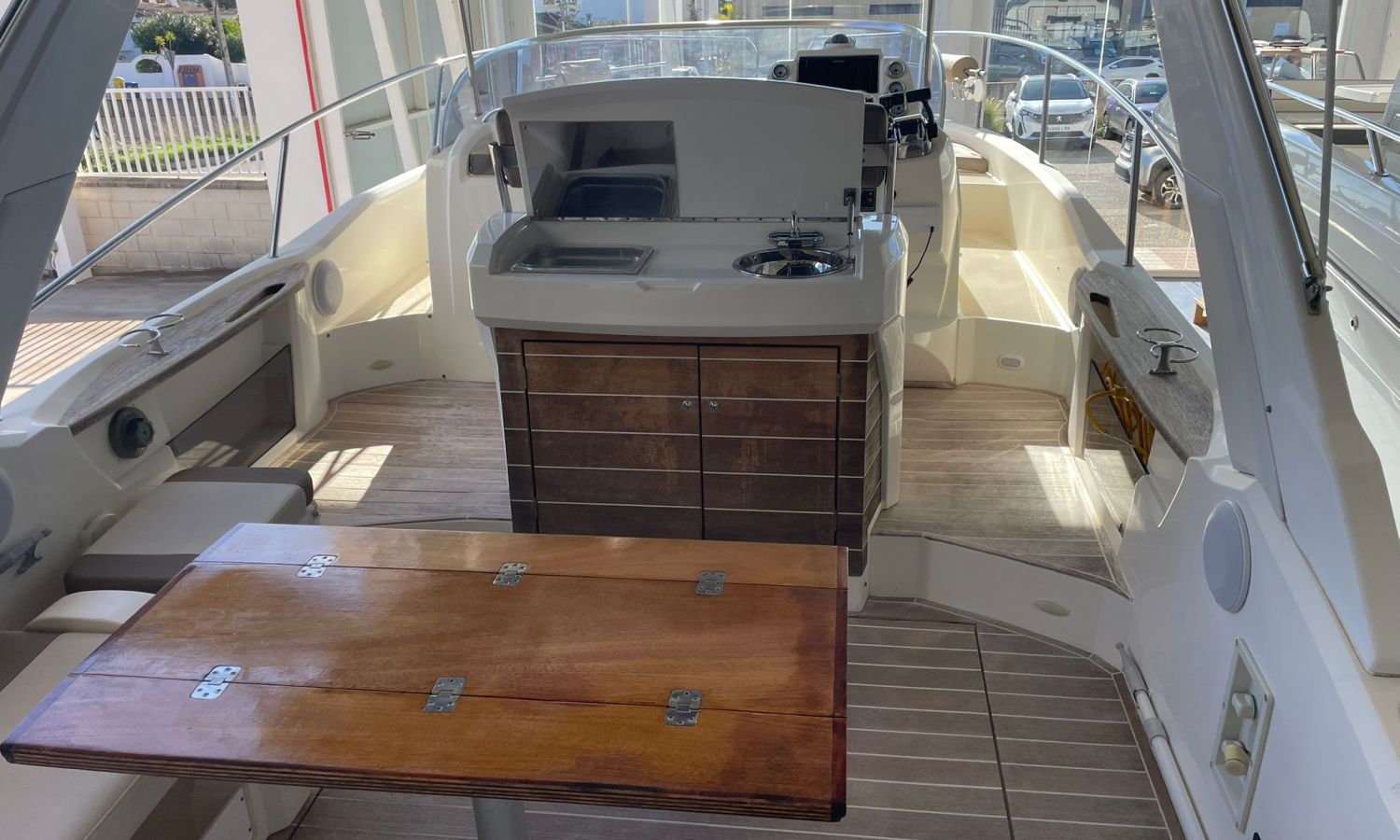 Guindeau électrique-Vhf-Sondeur Gps Plotter-Indicateurs Vesselview Smartcraft Mercury-Compteur Chaîne-Axius Mercruiser Joystick-Chargeur de batteries-Plateforme de bain-Douche a poupe-Distribution en forme de U dans le cockpit-Table cockpit transformable en solarium-Meuble bar avec évier dans le cockpit-Frigo 12 v dans le cockpit-Table salon convertible en lit-Toilette électrique-Douche dans la salle de bain-Lavabo dans la salle de bain avec eau chaud-Bimini-Taud mouillage-Coussin bain de soleil avant-modele Walk-around-Arc radar avec lumières-Grande cabine arrière/poupe avec lit double.Description du bateau