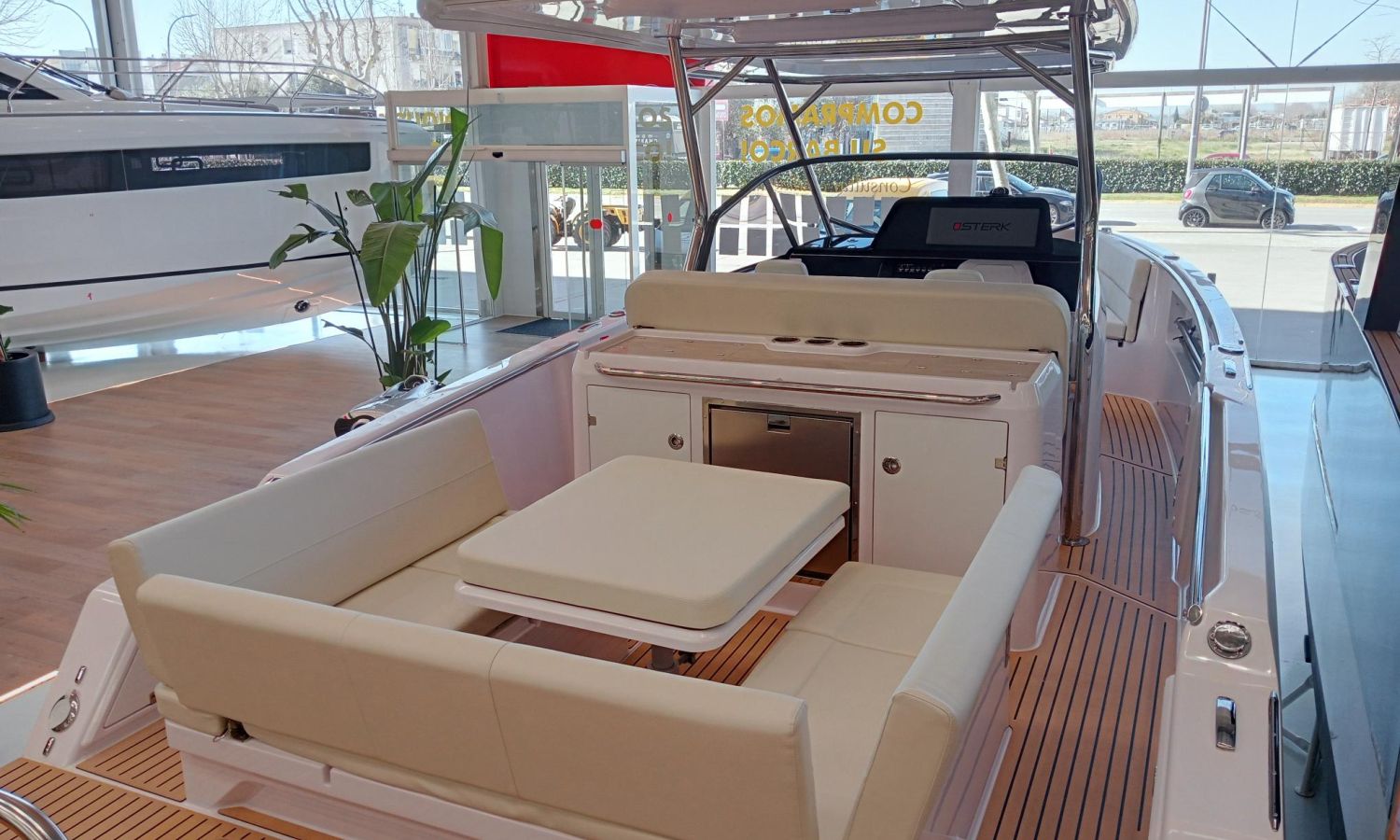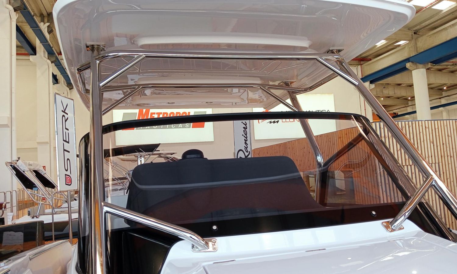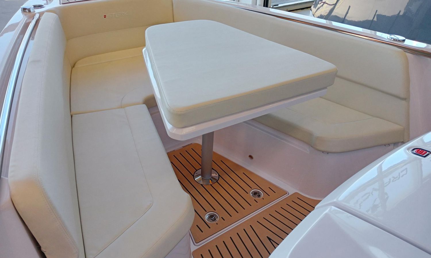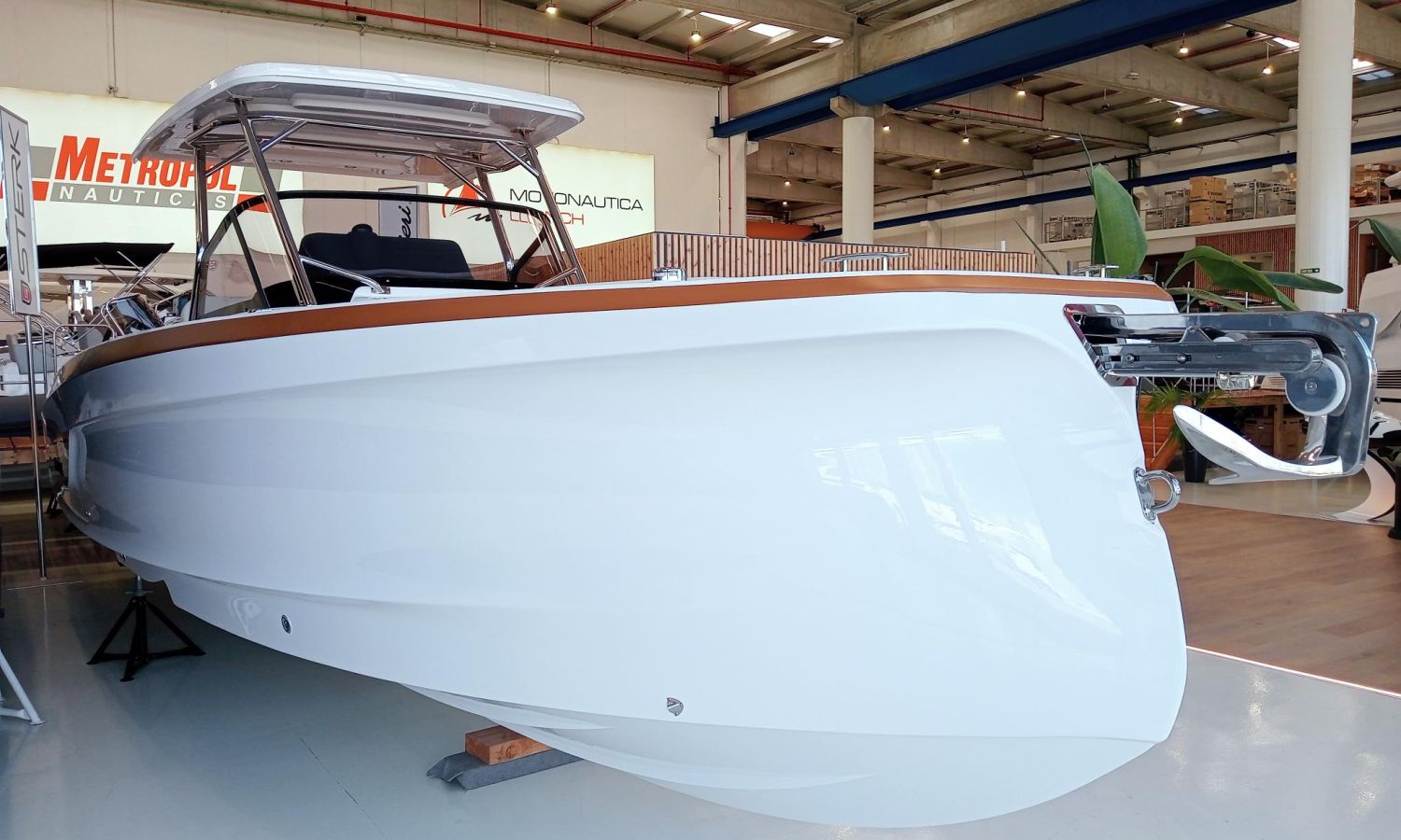 2 cornouailles en acier inox au centre de la coque - Taud bimini à l'arrière - WC électrique avec système d’égouts avec réservoir d’eaux usées 60 l - Système d’eau douce avec réservoir 130 l - Pack Hifi avec 2 haut-parleurs - Feux de navigation - Compas éclairé - Table de proue avec pied convertible en bain de soleil - Cabine de bain complète - Supplément pour porte-gobelet refroidis/chauffés - Bandes lamellaires en coque PRFV - Plasdeck teck à rayures noires - Chargeur de téléphone inductif 12 V - T-Top fabriqué en PRFV - Bande en vinyle laminée en T-Top - Prise de port avec chargeur - Peinture spéciale tableau de bord (haut) - Peinture spéciale tableau de bord (bas) - Guindeau électrique + kit de mouillage - Supplément couleur tapisserie - Certificat constructeurs - Transport jusqu’à la Costa Brava - Installation de moteurs - Peinture antifouling - Préparation, lancement et livraison avec essais en mer.Description du bateau