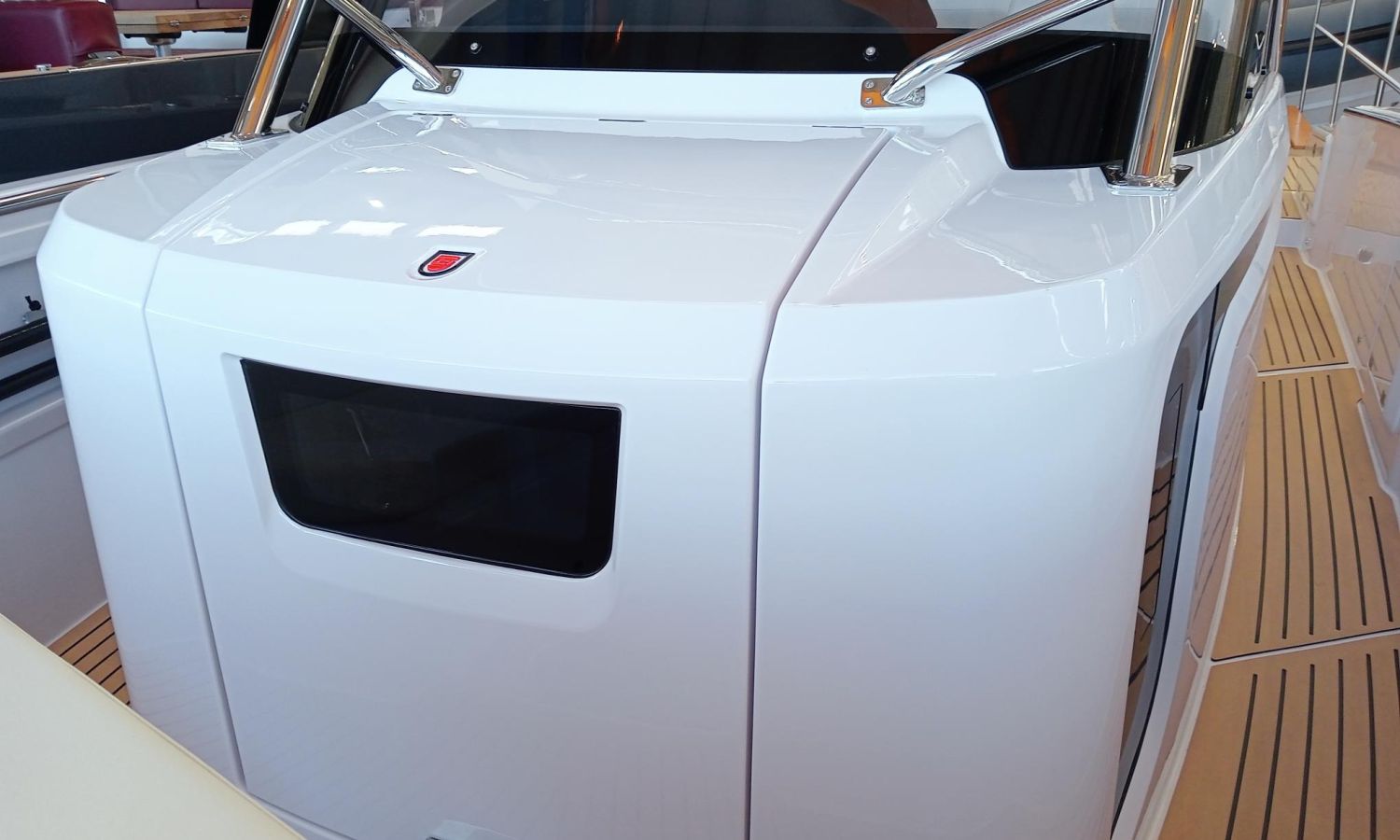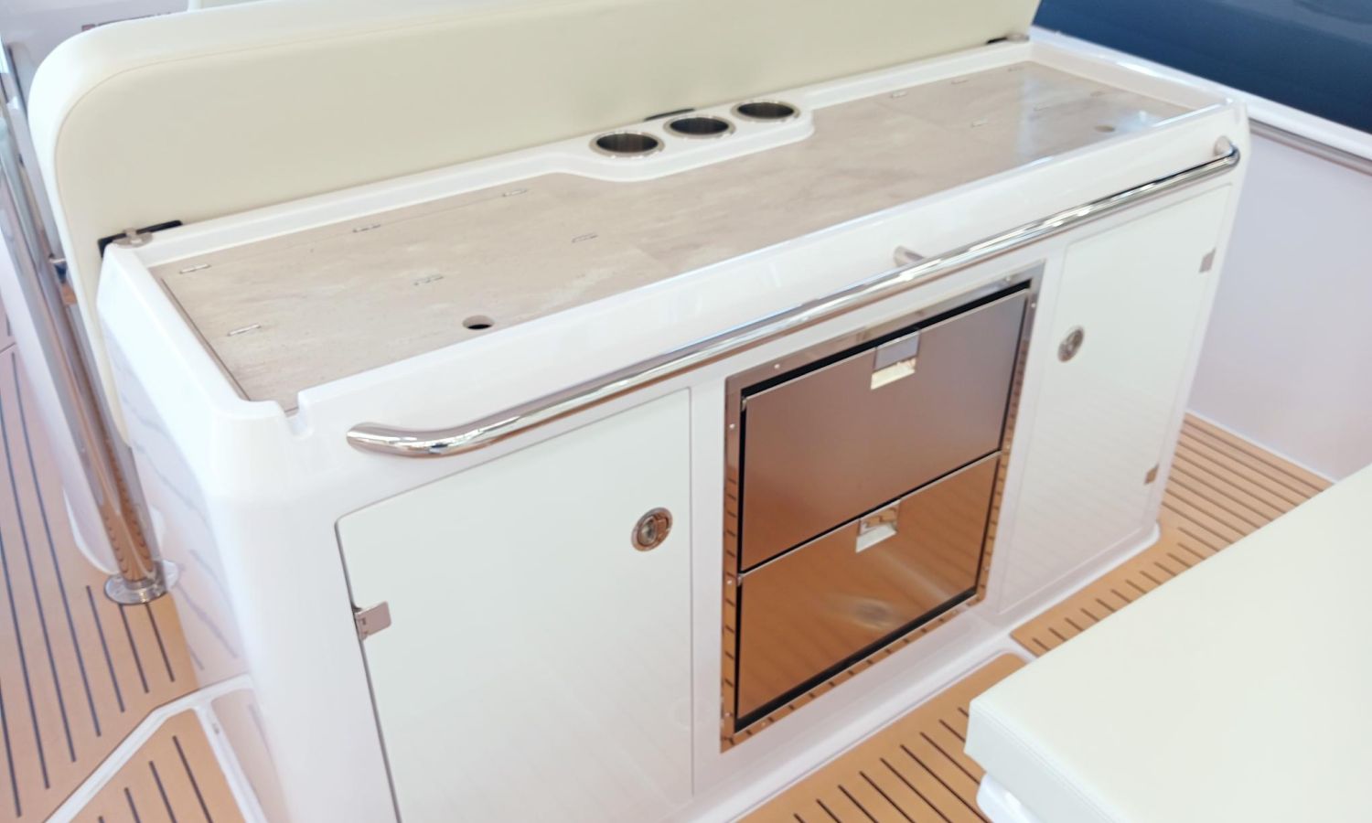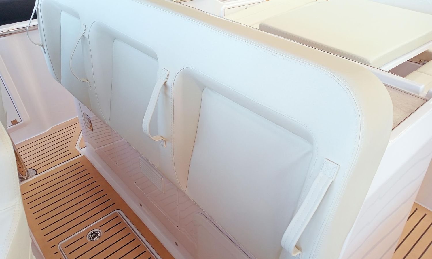 2 cornouailles en acier inox au centre de la coque - Taud bimini à l'arrière - WC électrique avec système d’égouts avec réservoir d’eaux usées 60 l - Système d’eau douce avec réservoir 130 l - Pack Hifi avec 2 haut-parleurs - Feux de navigation - Compas éclairé - Table de proue avec pied convertible en bain de soleil - Cabine de bain complète - Supplément pour porte-gobelet refroidis/chauffés - Bandes lamellaires en coque PRFV - Plasdeck teck à rayures noires - Chargeur de téléphone inductif 12 V - T-Top fabriqué en PRFV - Bande en vinyle laminée en T-Top - Prise de port avec chargeur - Peinture spéciale tableau de bord (haut) - Peinture spéciale tableau de bord (bas) - Guindeau électrique + kit de mouillage - Supplément couleur tapisserie - Certificat constructeurs - Transport jusqu’à la Costa Brava - Installation de moteurs - Peinture antifouling - Préparation, lancement et livraison avec essais en mer.Description du bateau