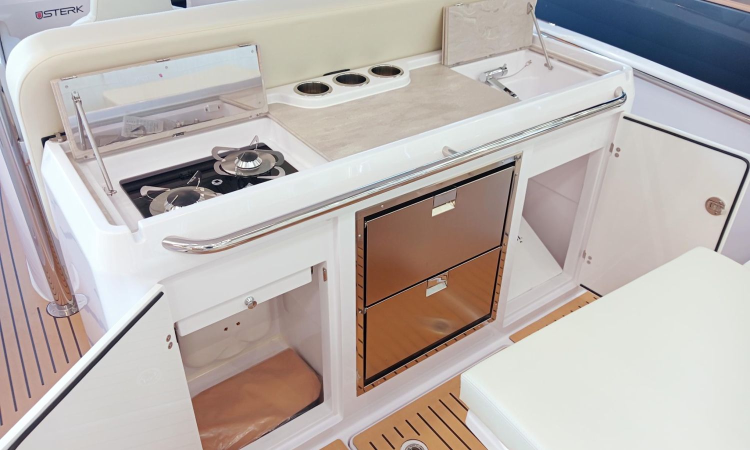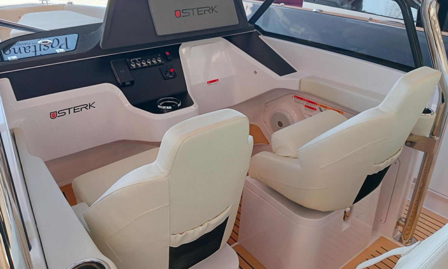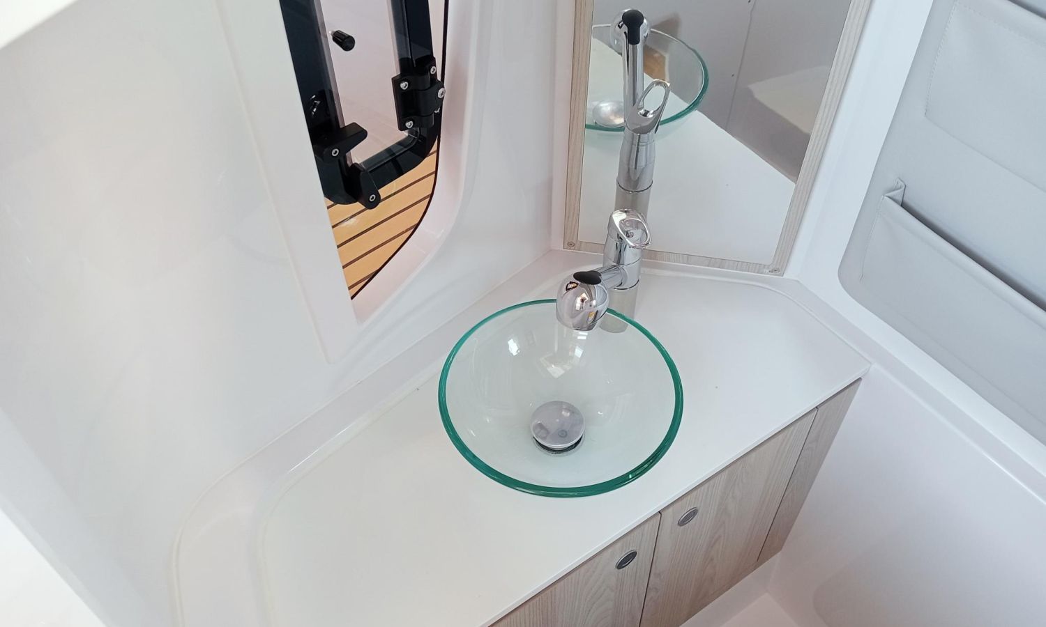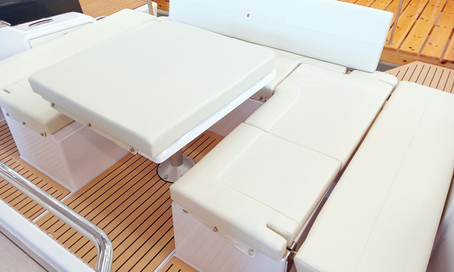2 cornouailles en acier inox au centre de la coque - Taud bimini à l'arrière - WC électrique avec système d’égouts avec réservoir d’eaux usées 60 l - Système d’eau douce avec réservoir 130 l - Pack Hifi avec 2 haut-parleurs - Feux de navigation - Compas éclairé - Table de proue avec pied convertible en bain de soleil - Cabine de bain complète - Supplément pour porte-gobelet refroidis/chauffés - Bandes lamellaires en coque PRFV - Plasdeck teck à rayures noires - Chargeur de téléphone inductif 12 V - T-Top fabriqué en PRFV - Bande en vinyle laminée en T-Top - Prise de port avec chargeur - Peinture spéciale tableau de bord (haut) - Peinture spéciale tableau de bord (bas) - Guindeau électrique + kit de mouillage - Supplément couleur tapisserie - Certificat constructeurs - Transport jusqu’à la Costa Brava - Installation de moteurs - Peinture antifouling - Préparation, lancement et livraison avec essais en mer.Description du bateau